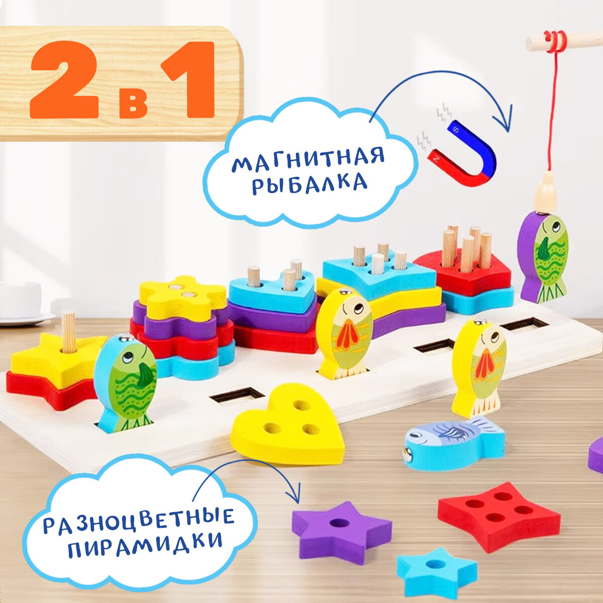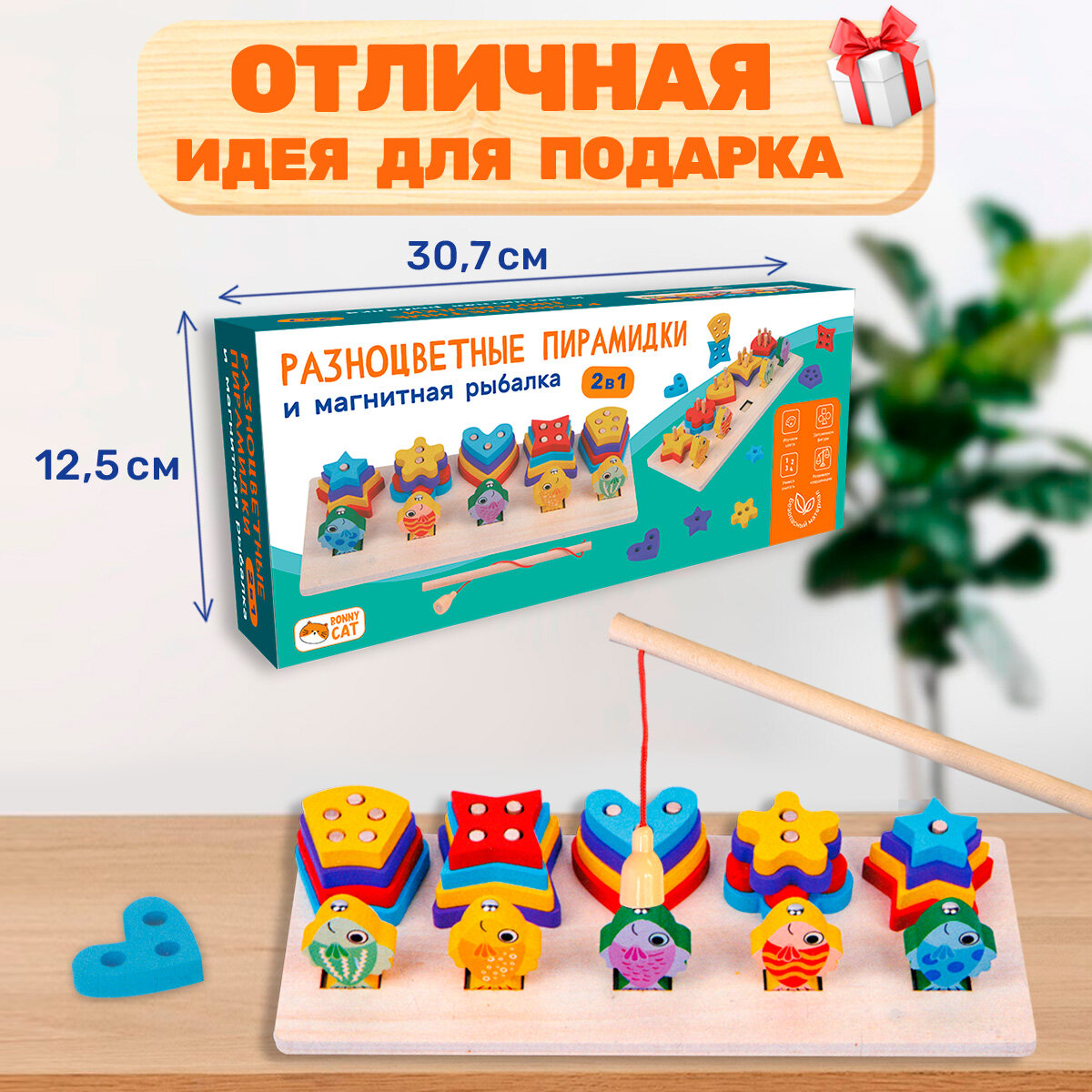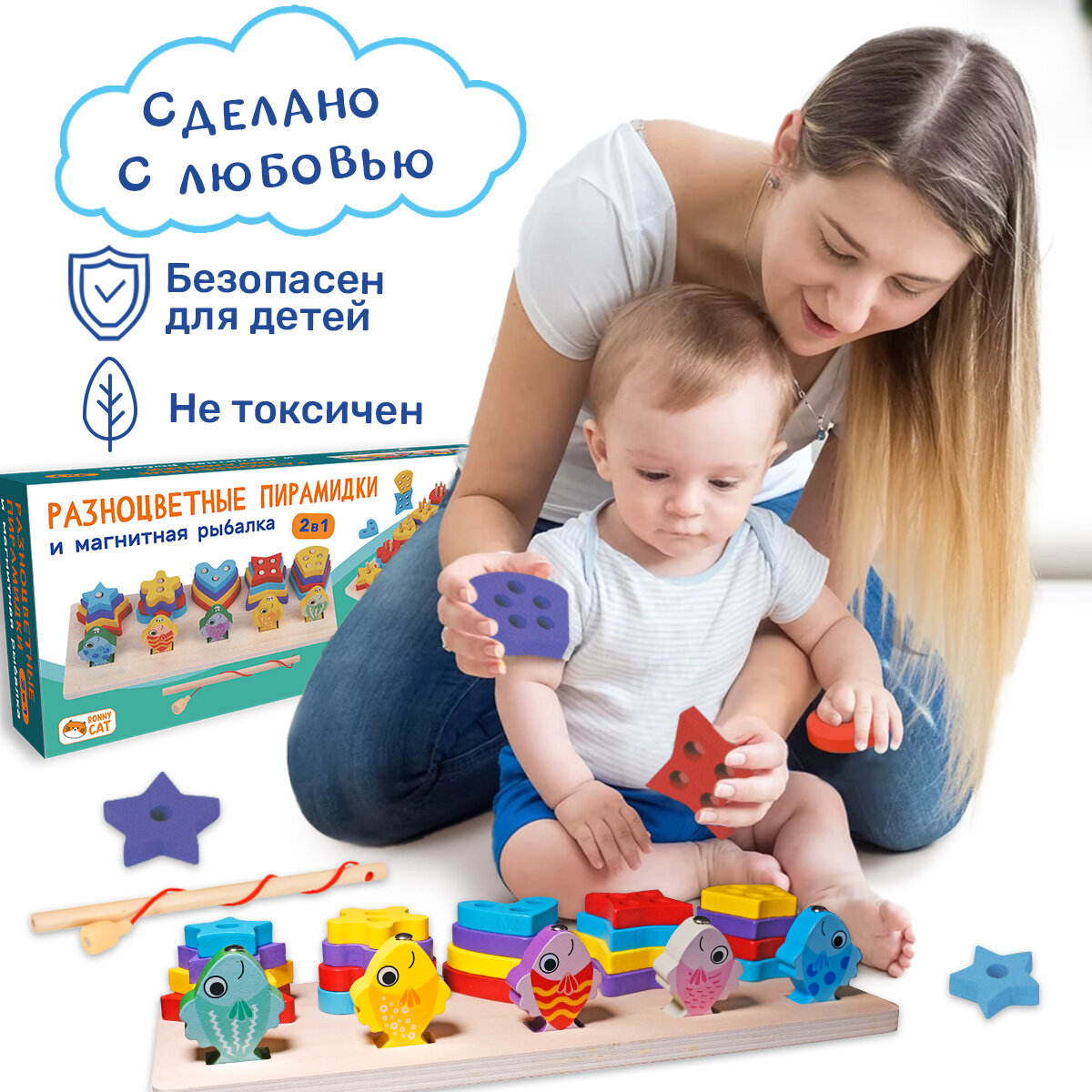 Развивающая игрушка сортер. Пирамидки и рыбалка. BONNY CAT. Разноцветные пирамидки и магнитная рыбалка. 2 в 1 интересное: