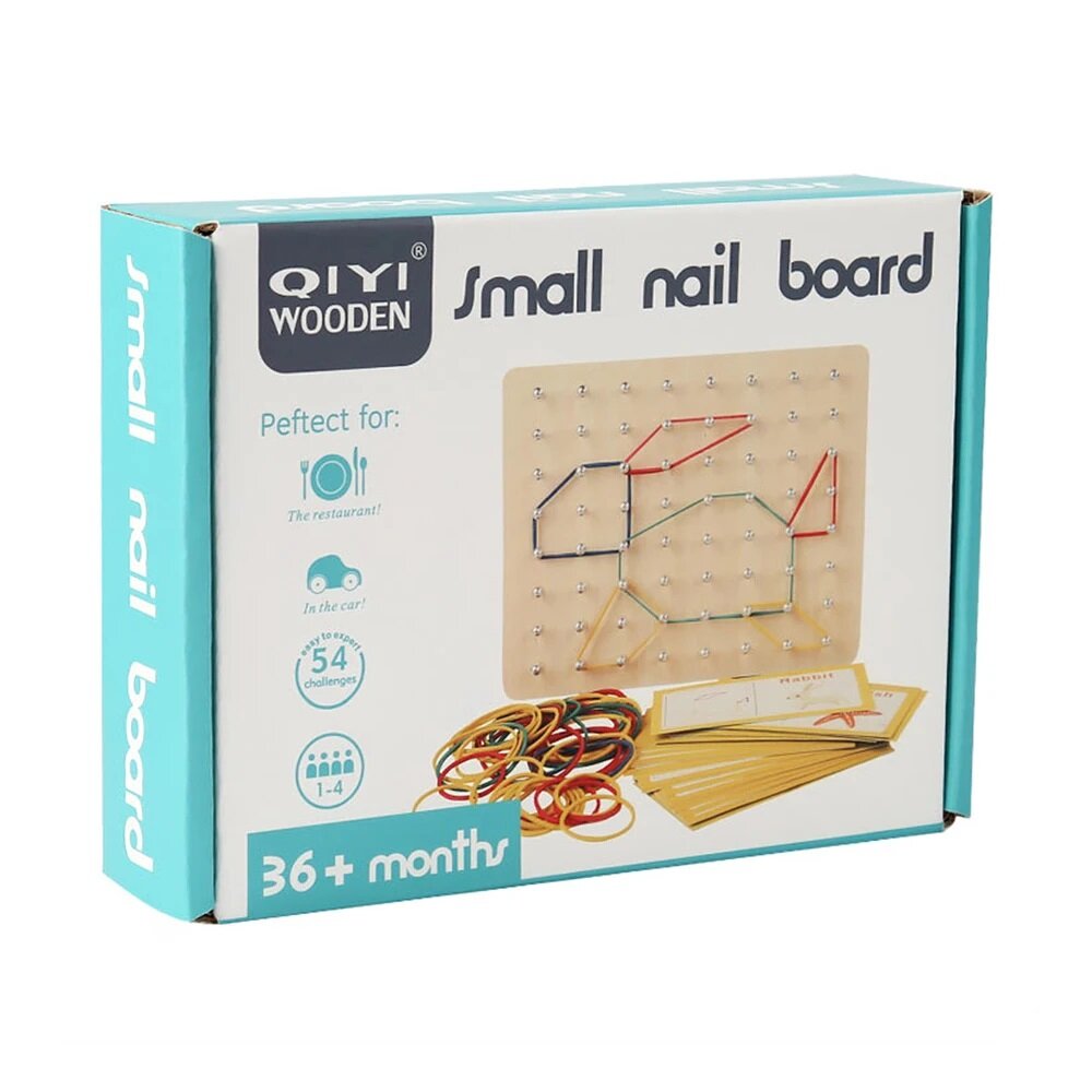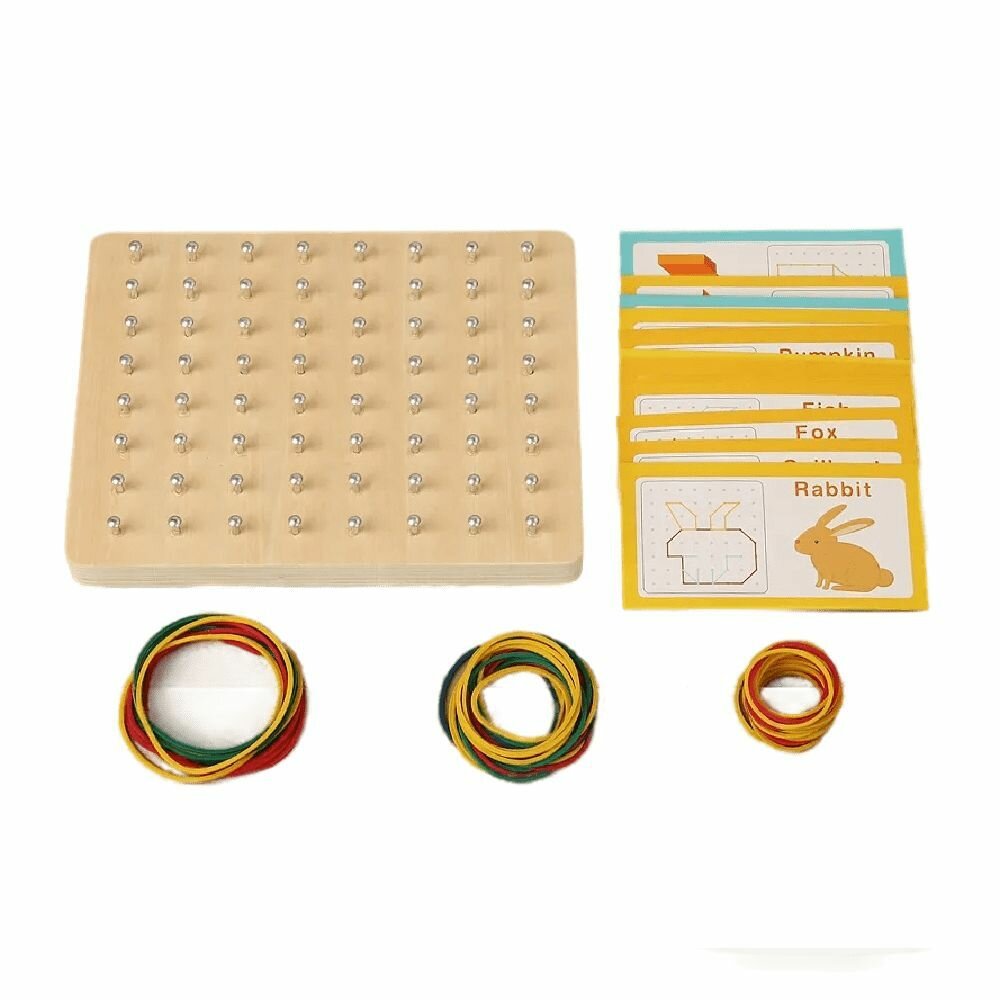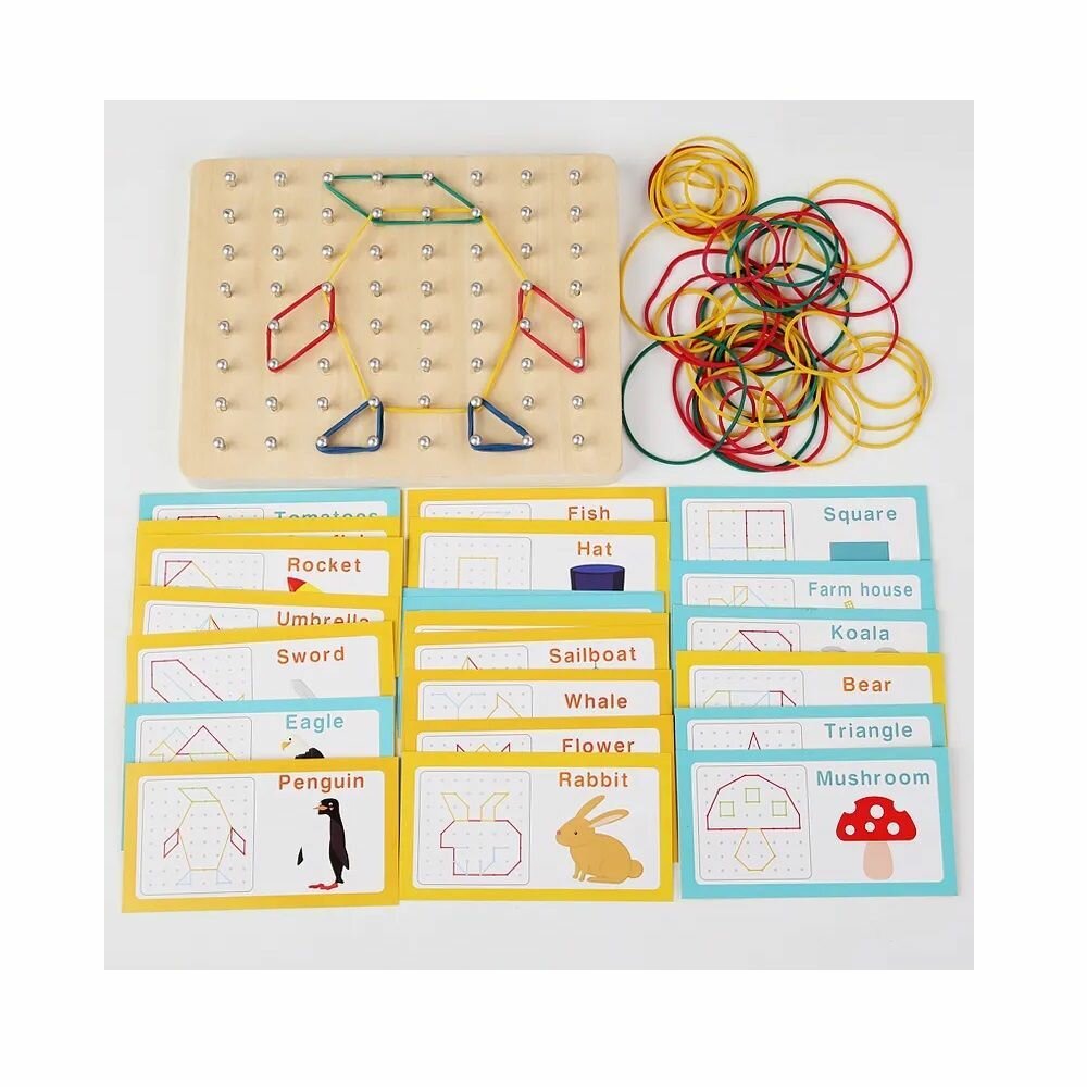 Купить Развивающая деревянная игрушка Геоборд с резинками деревянный 17,5 х 14 х 2,5 см, карточки с заданиями, разноцветные резиночки, STJ01397
