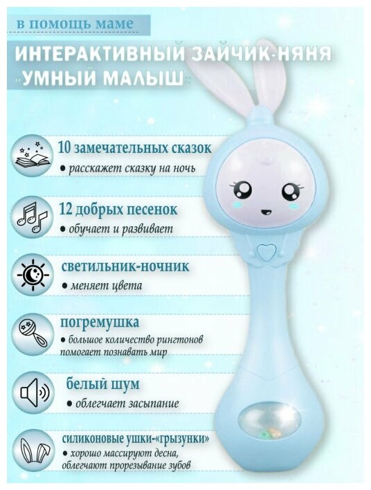 Музыкальная интерактивная развивающая игрушка-погремушка Умный малыш зайчик, голубой интересное: