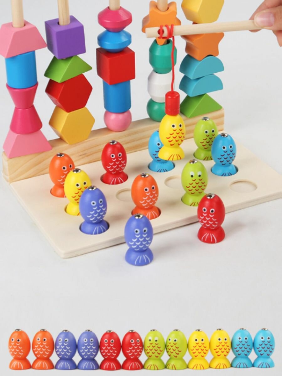 Сортер для малышей деревянный/ Развивающая игрушка по Монтессори/Пирамидки-рыбалка-фигурки