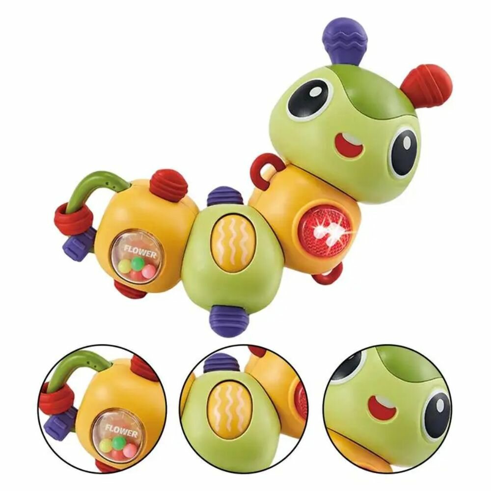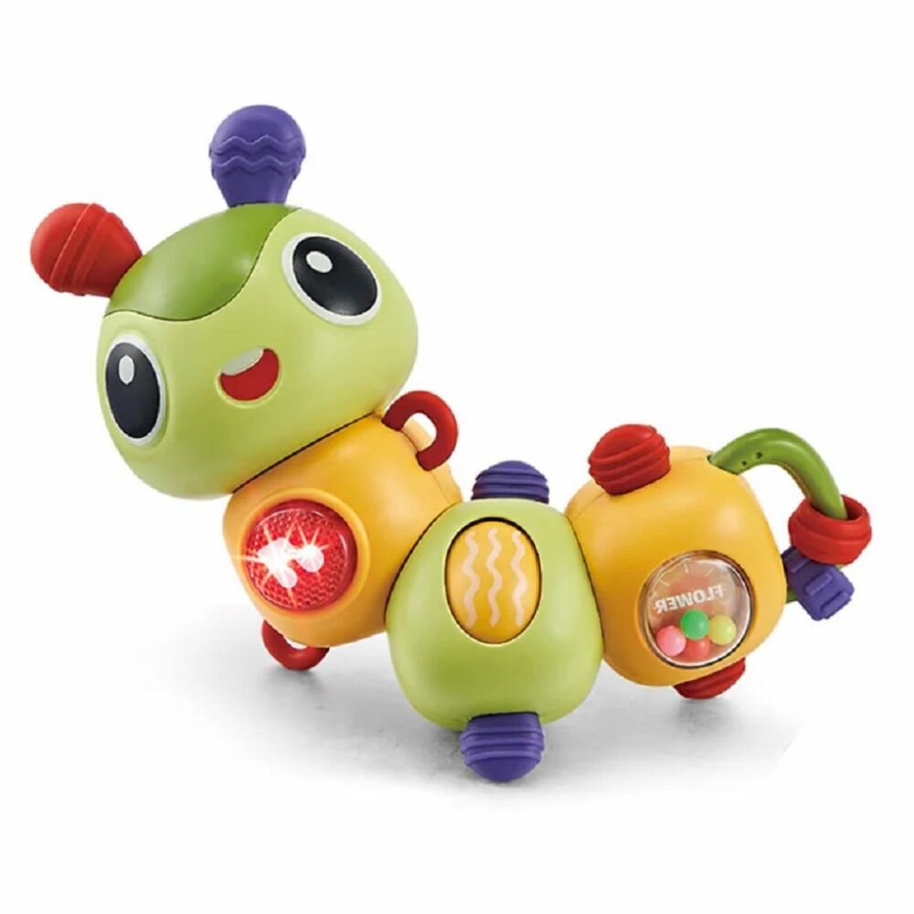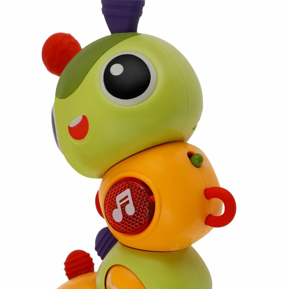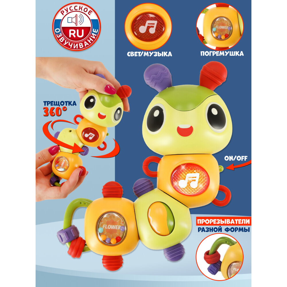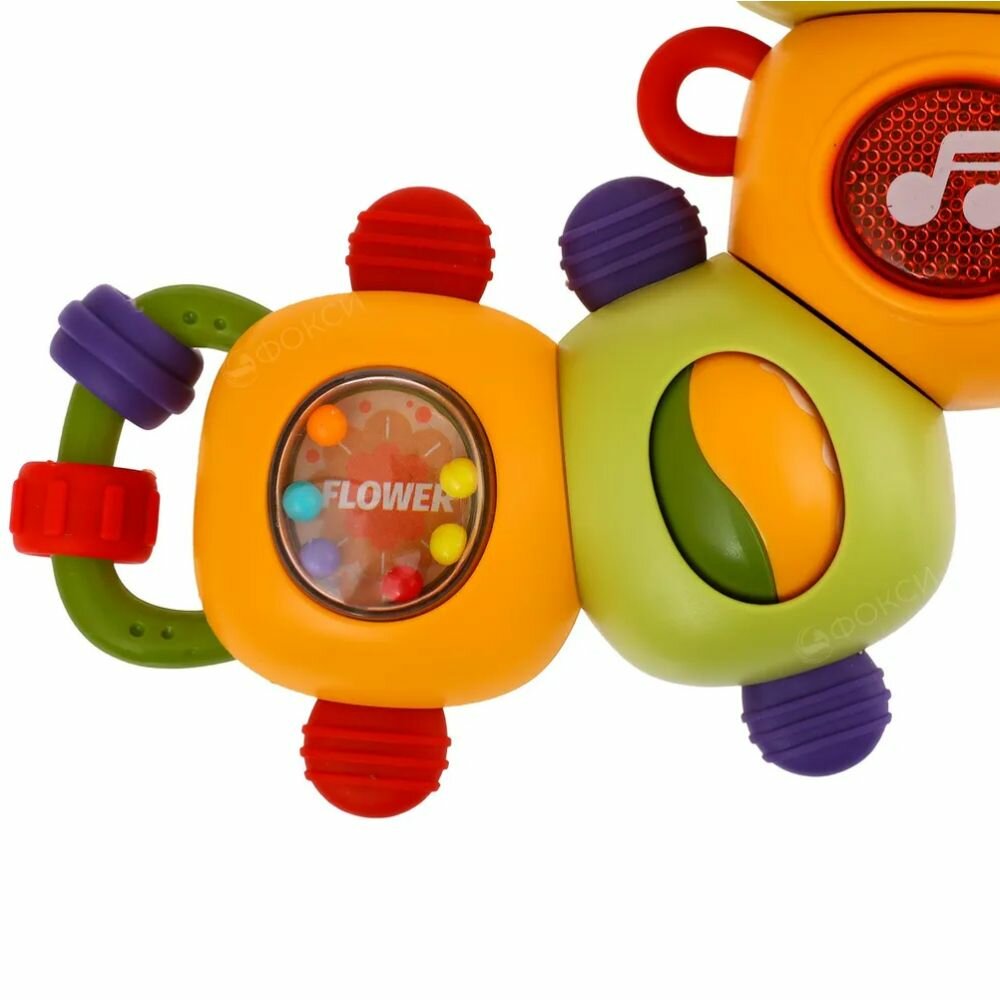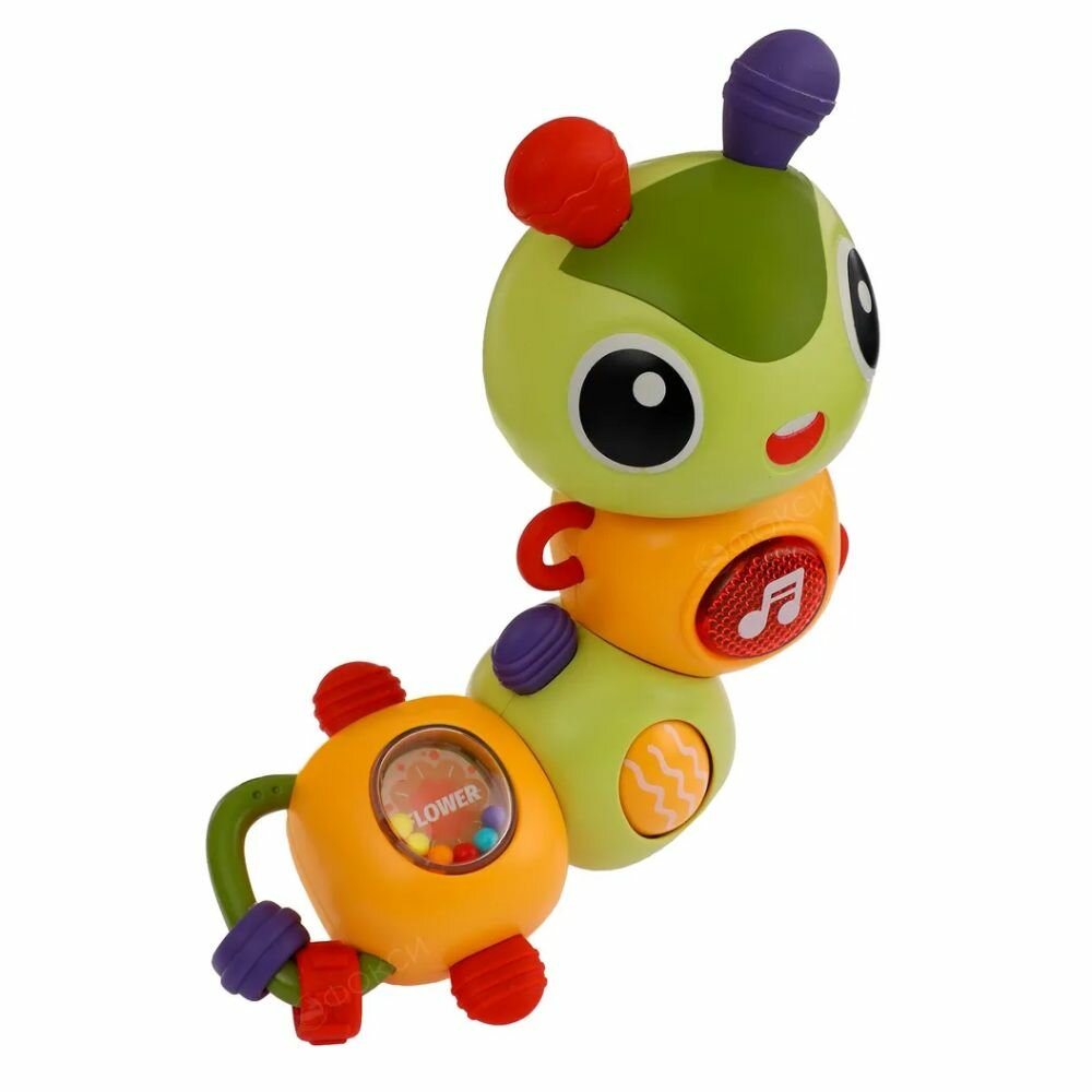 Музыкальная игрушка погремушка Гусеница 17 х 6 х 13 см на батарейках, с прорезывателем, звуковые и световые эффекты, 3 песни на русском языке интересное: