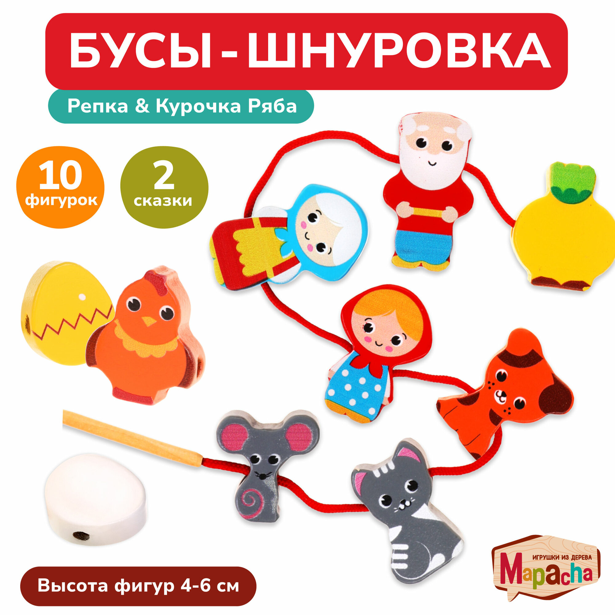Купить Деревянная шнуровка для детей Mapacha развивающая, 2 в 1 Курочка Ряба+ Репка, 10 бусин