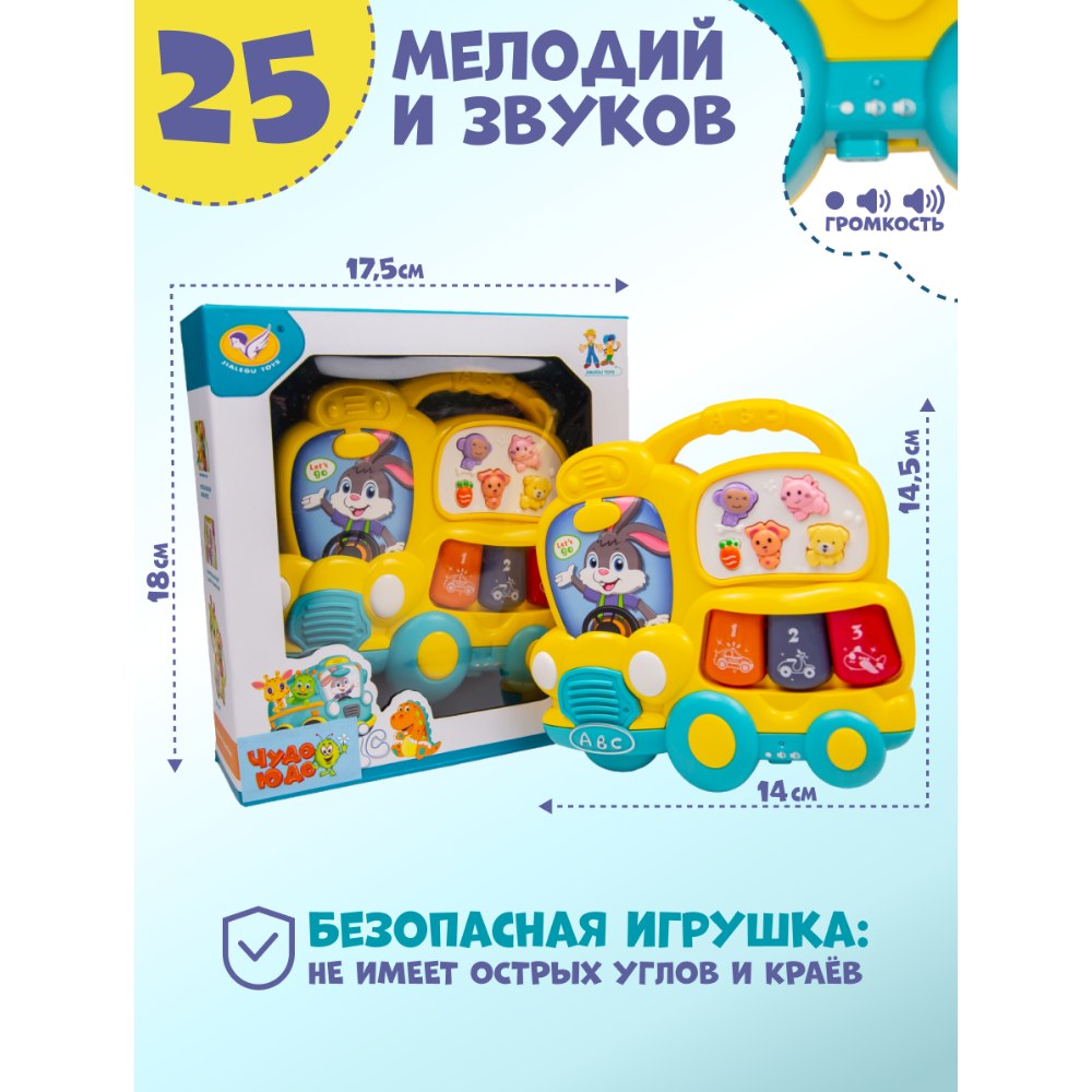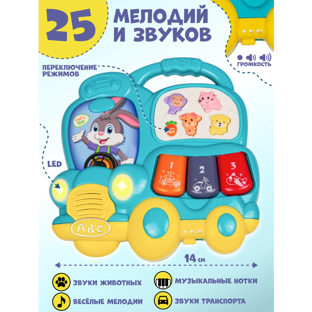 Музыкальное детское пианино "Веселый Автобус" для малышей с подсветкой, 25 звуков и мелодий, 14 х 2 х 14,5 см интересное: