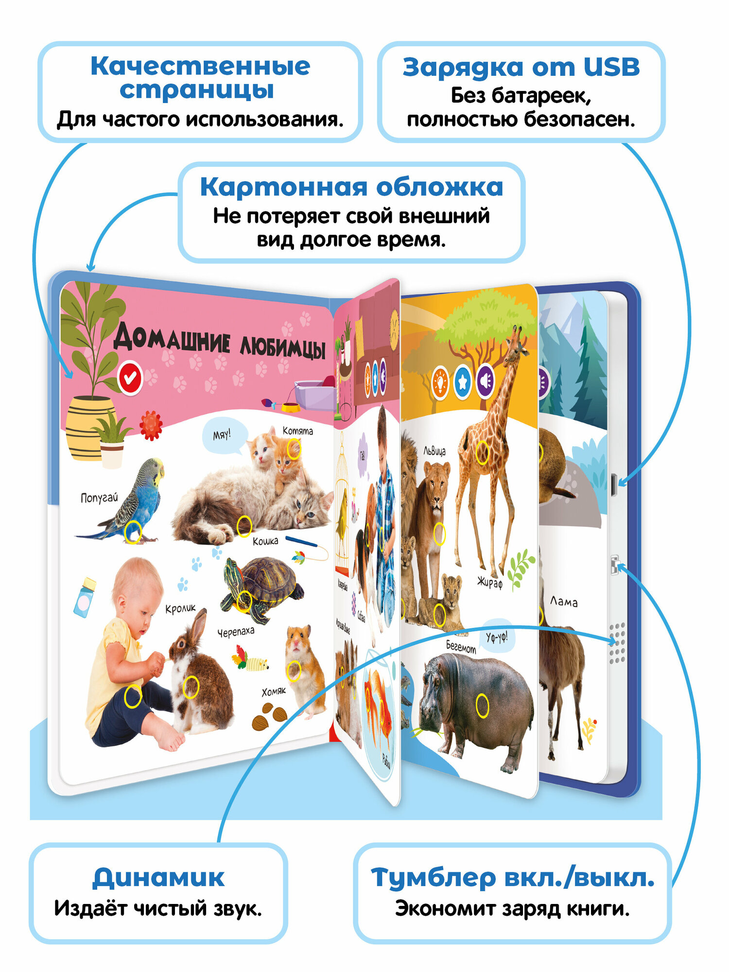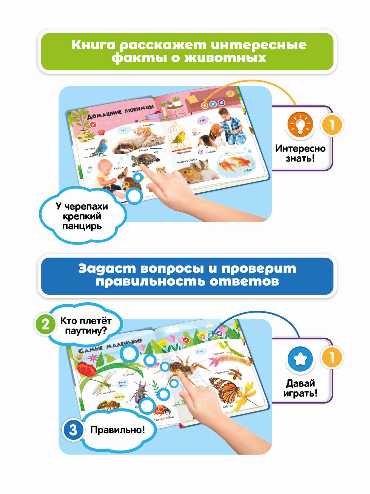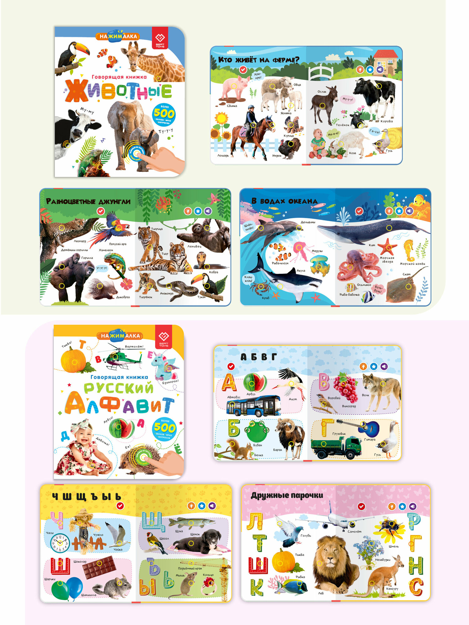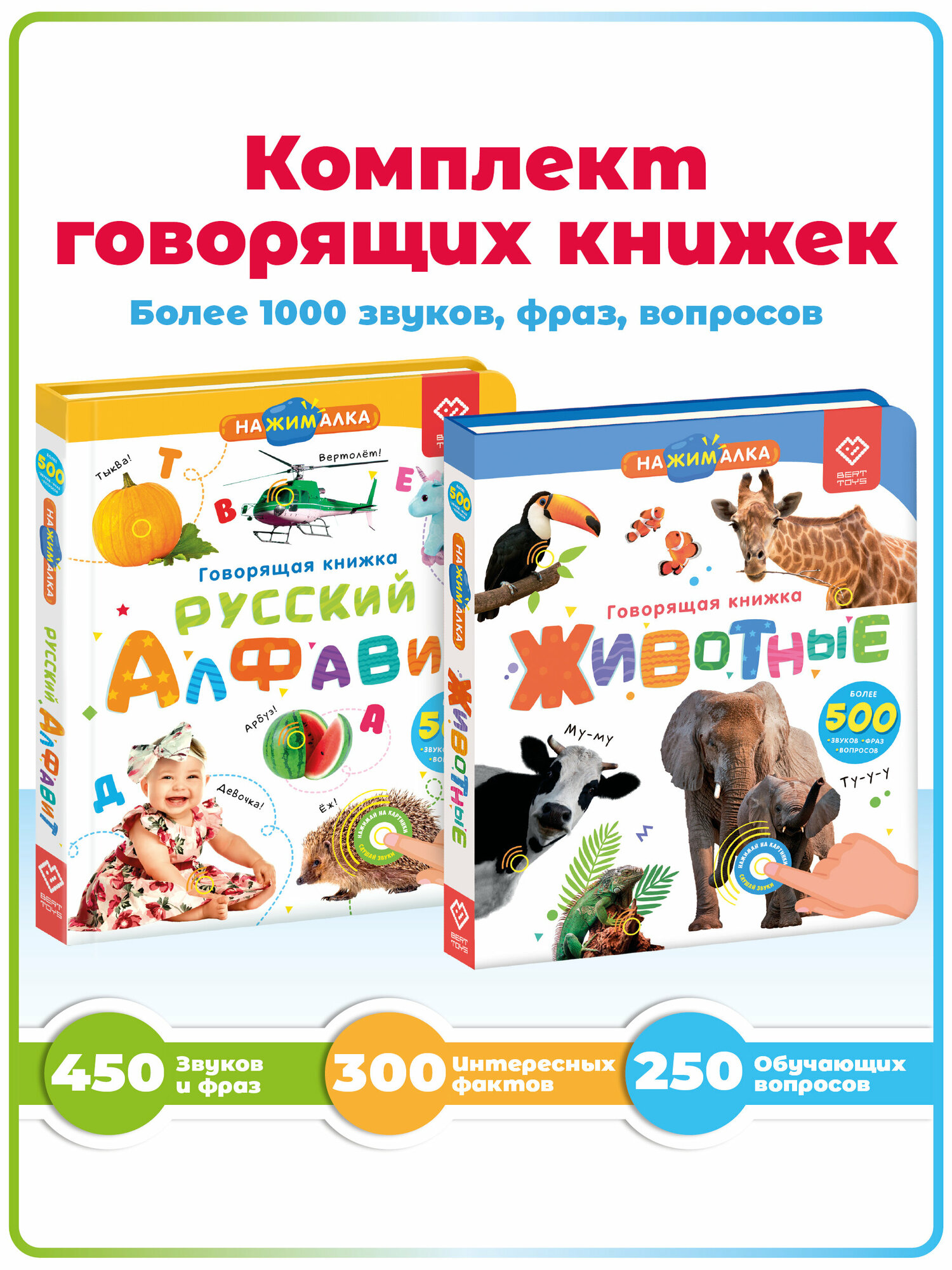 Интерактивная книжка-игрушка для детей BertToys "Нажималка" 2в1 "Животные" и "Я и Мир Вокруг"
