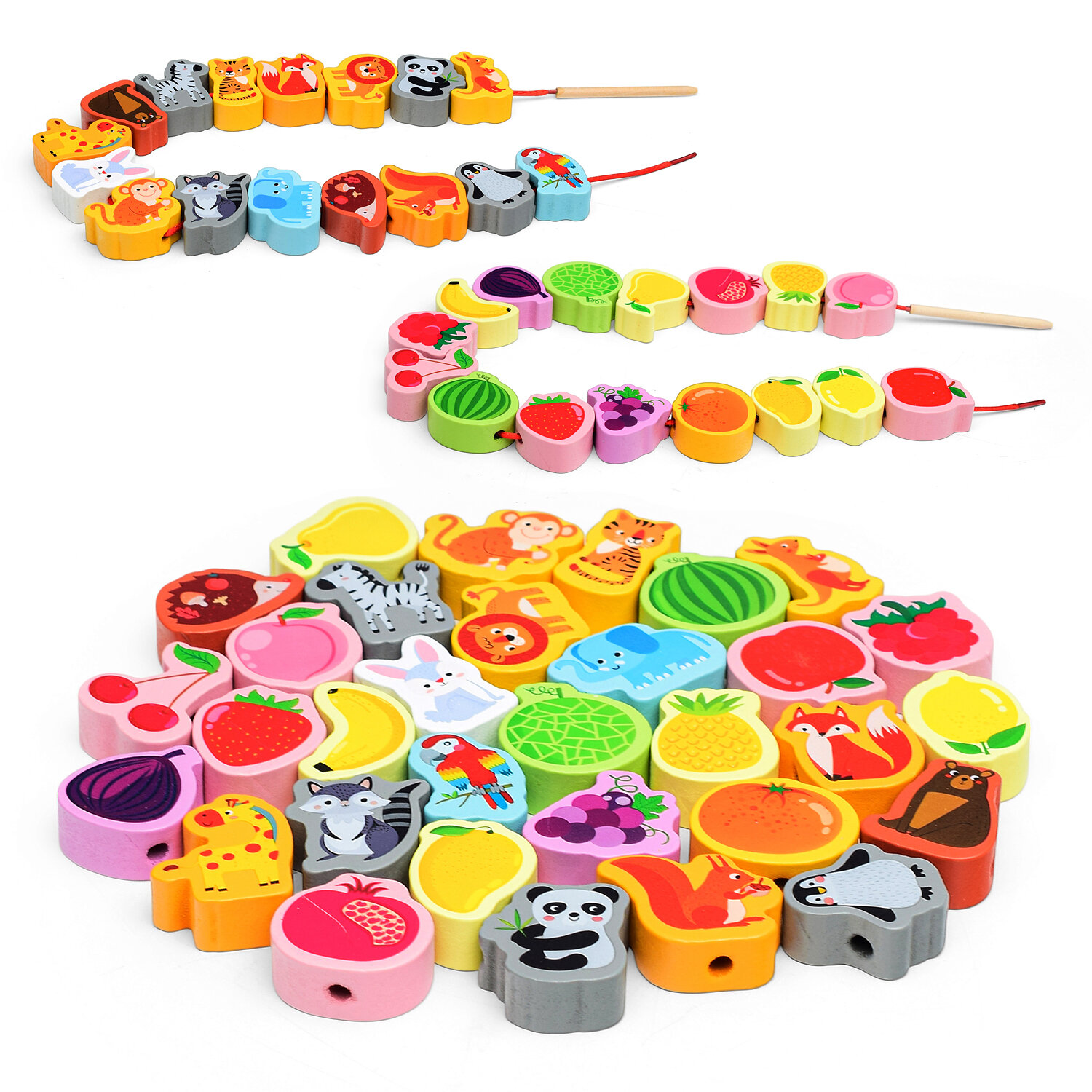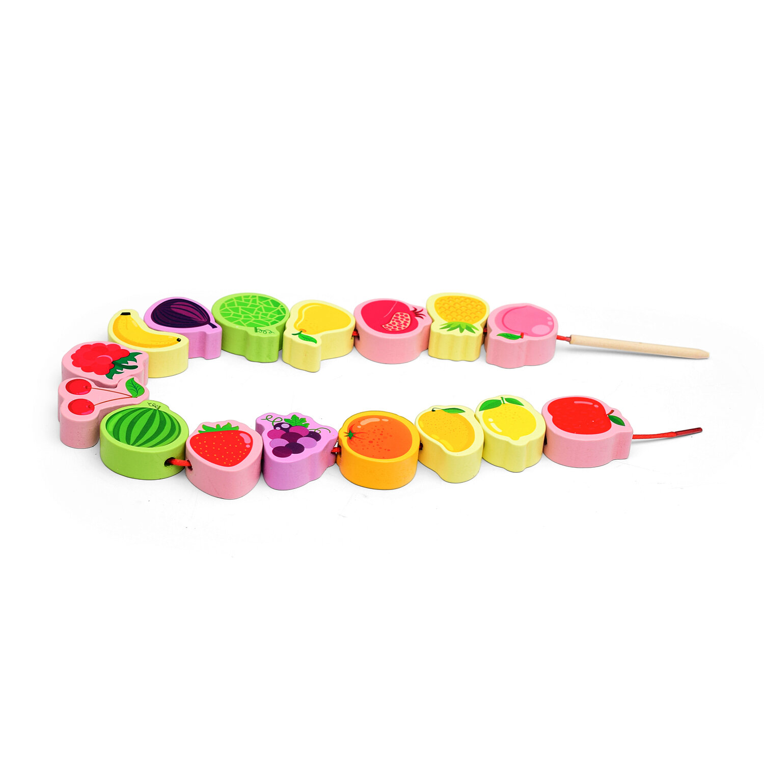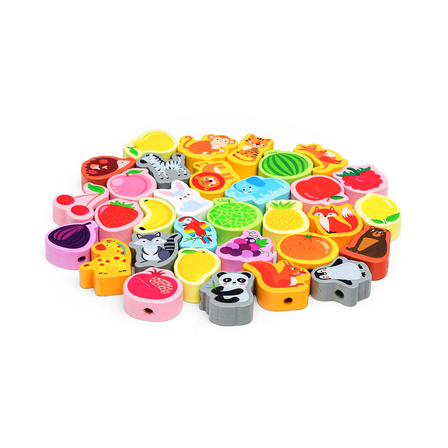 Купить Шнуровка деревянная "Фрукты и дикие животные" 32 фигурки, шнурок 67 см. в пакете D1606-2