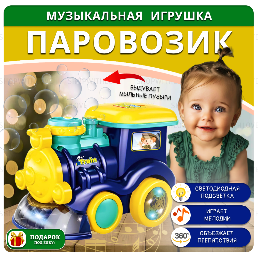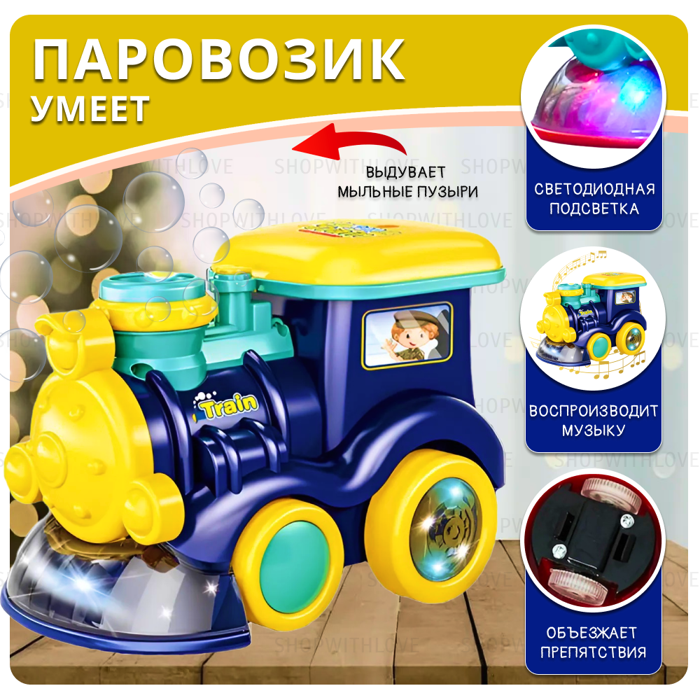 Интерактивная игрушка музыкальный паровозик, генератор мыльных пузырей, синий интересное: