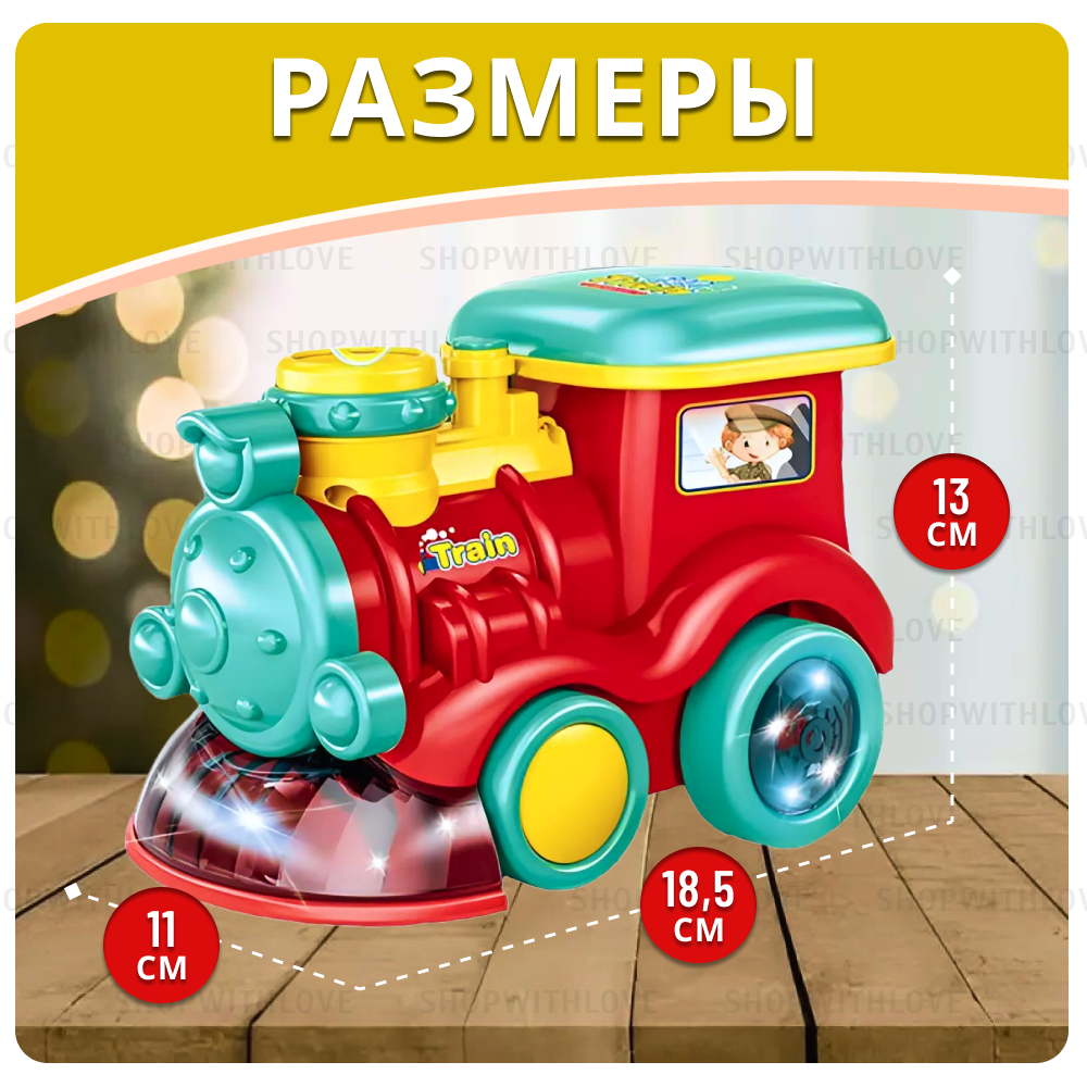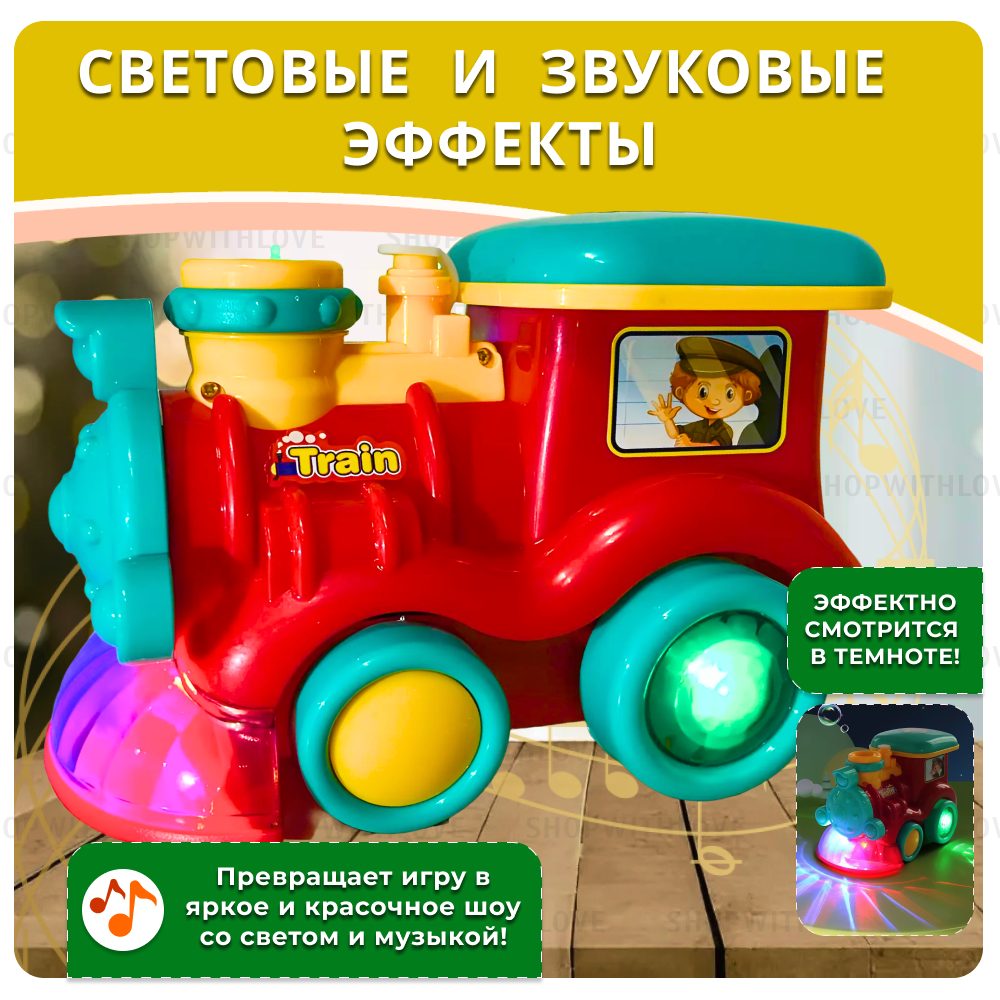 Интерактивная игрушка музыкальный паровозик, генератор мыльных пузырей, красный интересное: