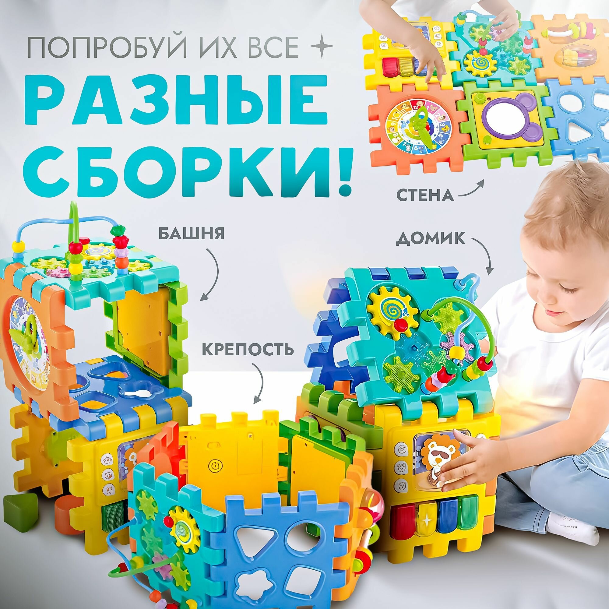 Интерактивный развивающий бизикуб Sharktoys, 10 элементов, свет и музыка, игровой центр для малыша интересное: