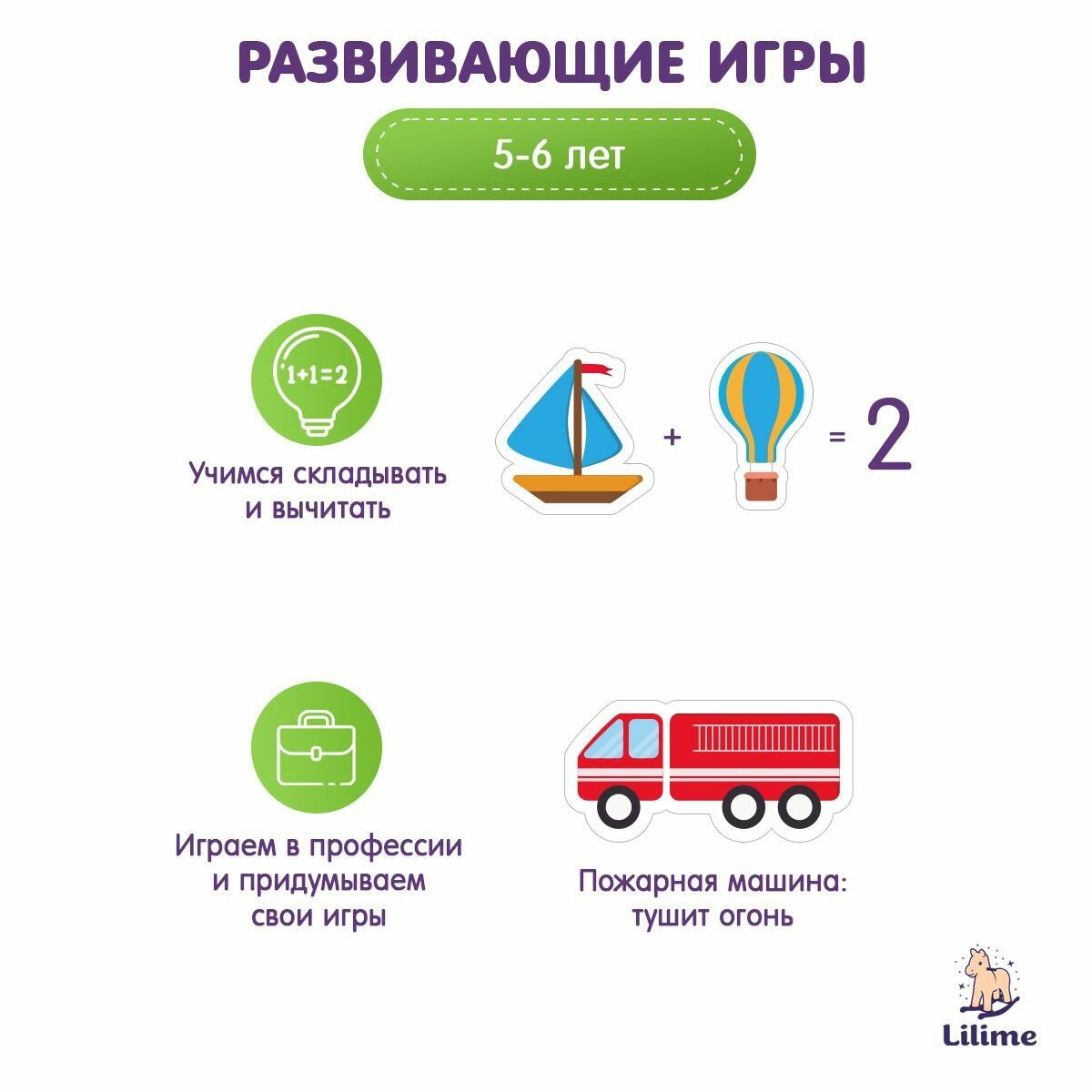 | Развитие навыков | Внимание, Кругозор, Логика, Моторика, Память, Социальные навыки, Фигуры, цвета |