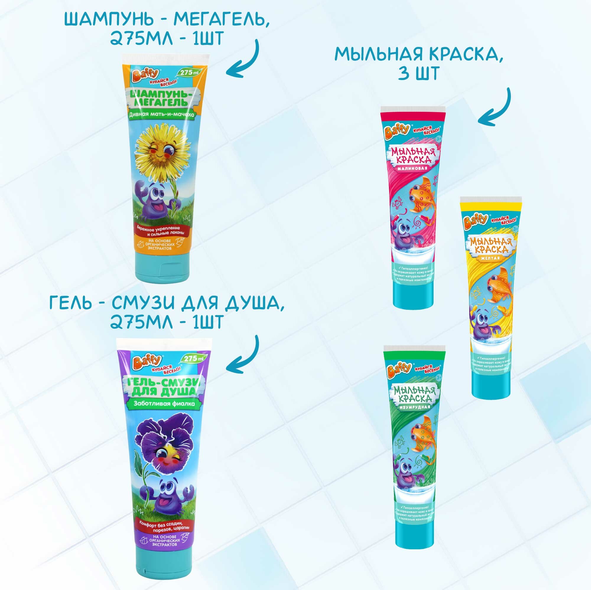 | Комплектация | детский шампунь - мегагель -1 шт, гель - смузи - 1шт, краска для рисования в ванной - 3шт, бумага для упаковки подарка - 1шт, растущая фигурка рыбка - 1шт |