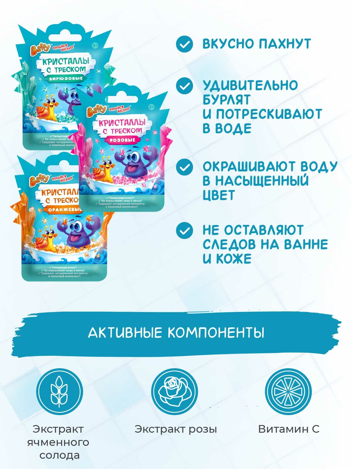 | Комплектация | желе для игры в ванне - 1шт, кристаллы с треском - 2шт, цветные таблетки - 1шт, бумага для упаковки подарка - 1шт |