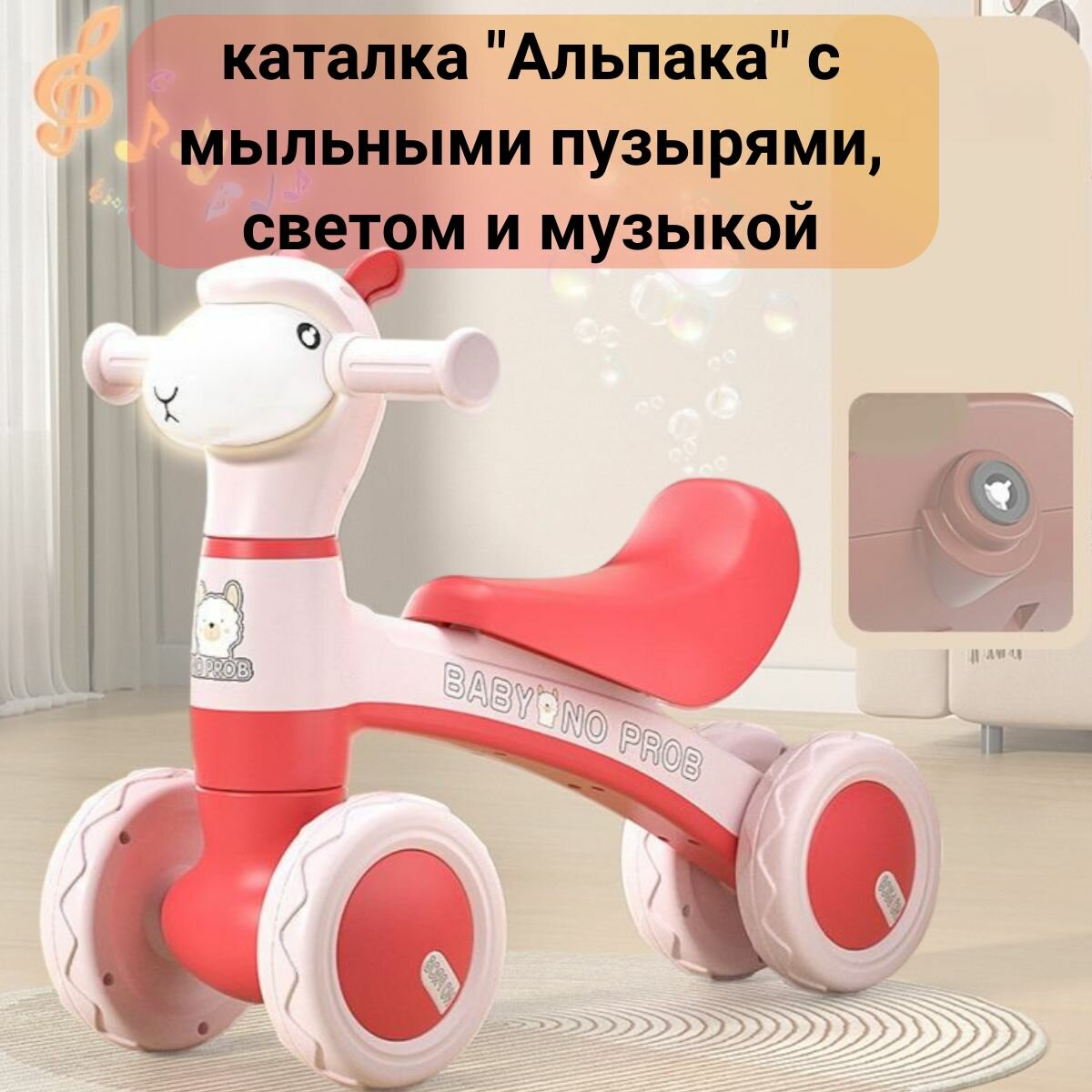 Детская каталка беговел Альпака с мыльными пузырями, музыкой и светом розовая интересное: