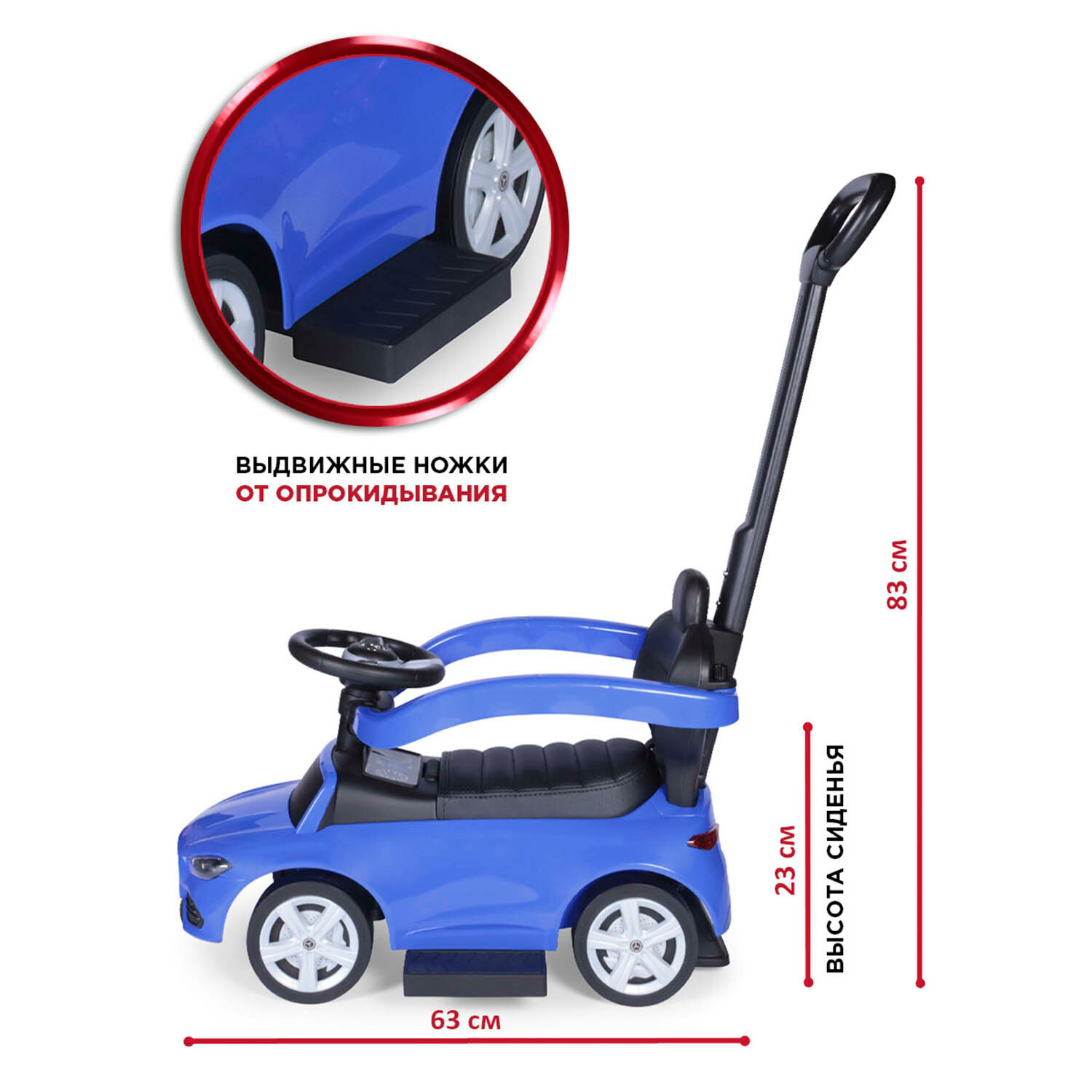 | Дополнительная информация | высота сиденья от уровня пола: 23 см; диаметр резиновых: колёс 13 см |