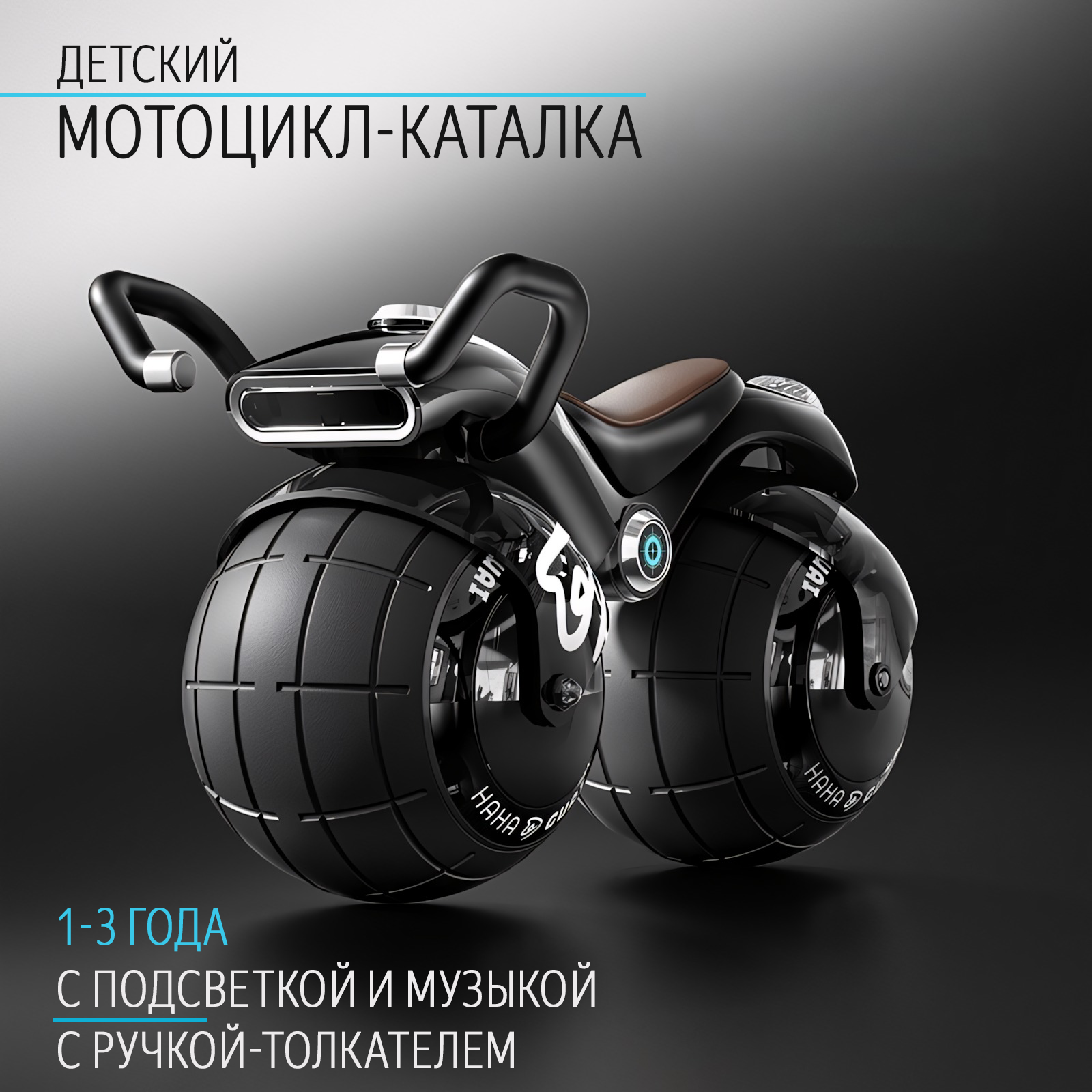 Купить Детская каталка мотоцикл черного цвета с подсветкой и музыкой, с родительской ручкой