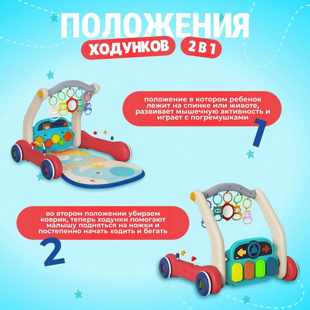 Ниже Вы можете прочитать отзывы на Развивающие ходунки 2 в 1 : хорошая устойчивость, музыка, подсветка, ознакомится с подробными характеристиками, посмотреть интересные обзоры и фотографии на Развивающие ходунки 2 в 1 : хорошая устойчивость, музыка, подсветка.