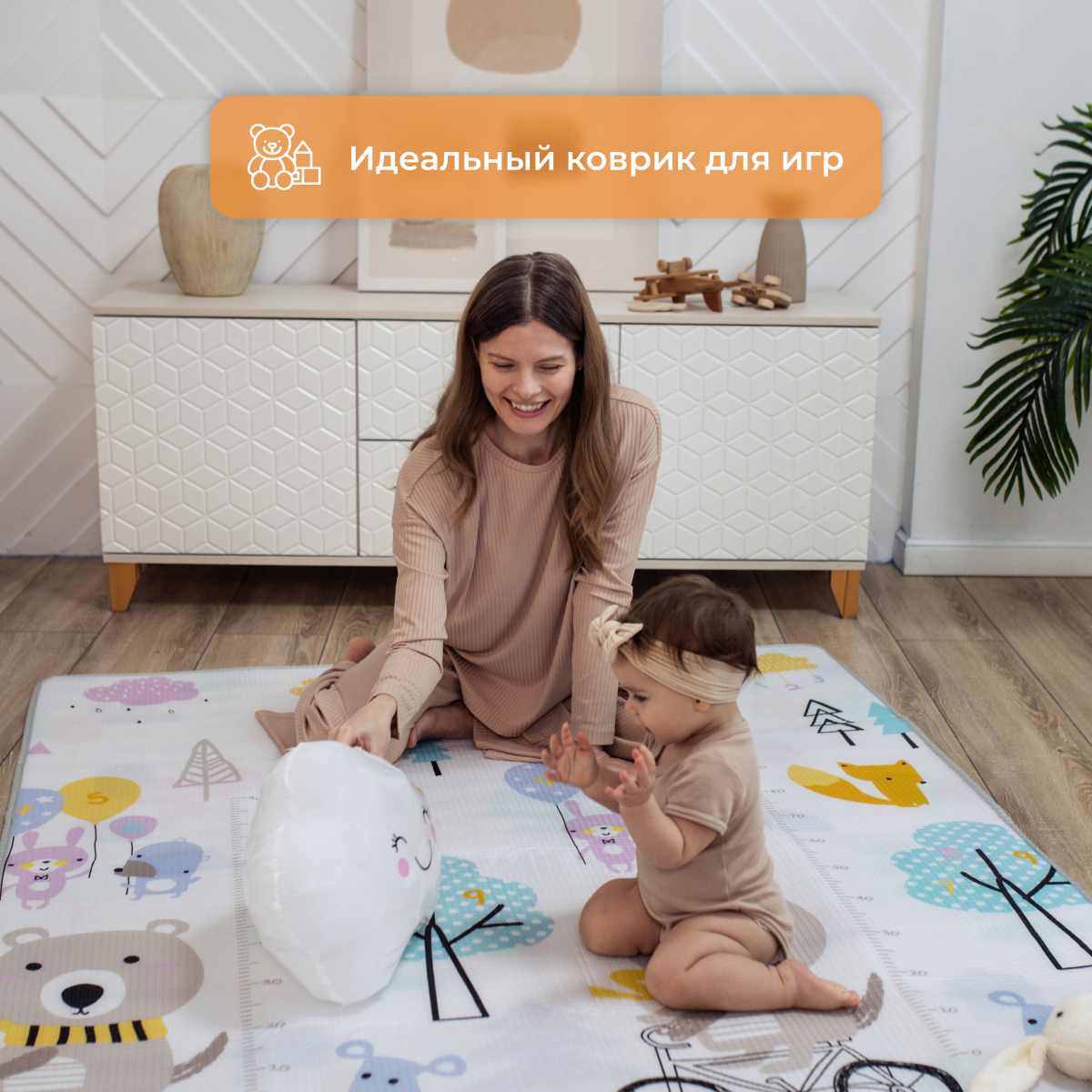СохранитьРазвивающий коврик детский Mamagoods для ползания складной двусторонний игровой 145 x 180 см Мишки на велосипедах и Лес интересное: