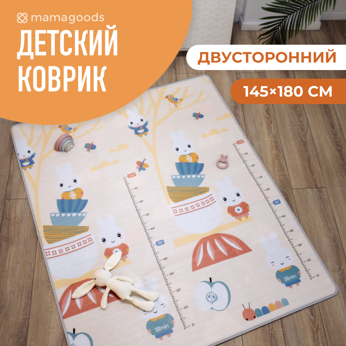 Развивающий коврик детский для ползания Mamagoods 145 x 180 см Облачка и Зайки в чашках интересное: