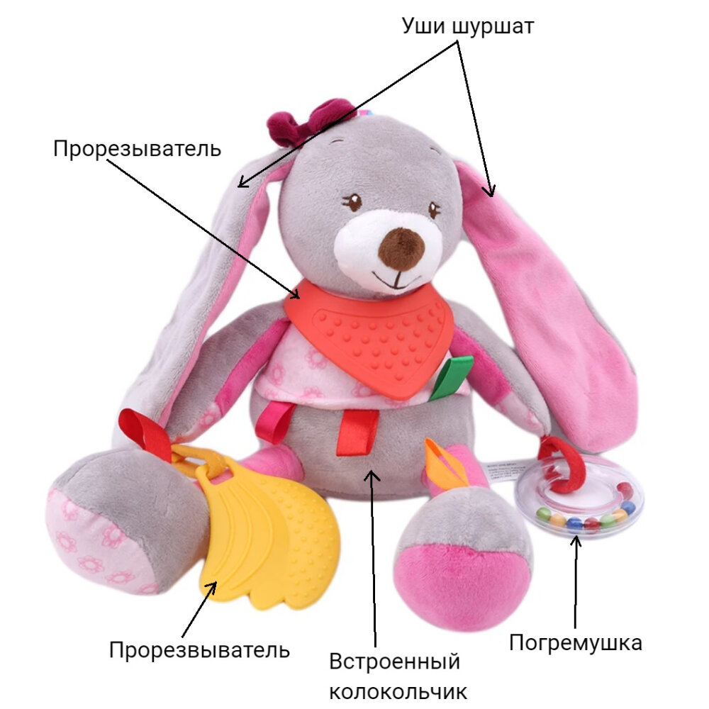 СохранитьИгрушка для развития малыша мягкая Подвеска Зайка, погремушка с прорезывателем для новорожденного в кроватку, на коляску, 15 х 9 х 28 см, KYB22F-004 интересное: