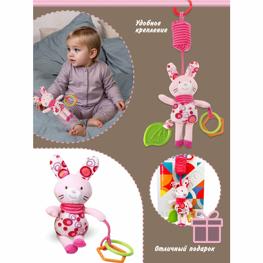 СохранитьПогремушка мягкая Зайка, подвеска на кроватку с прорезывателем для новорожденного, на коляску, 42 см, KYB22D-040 интересное: