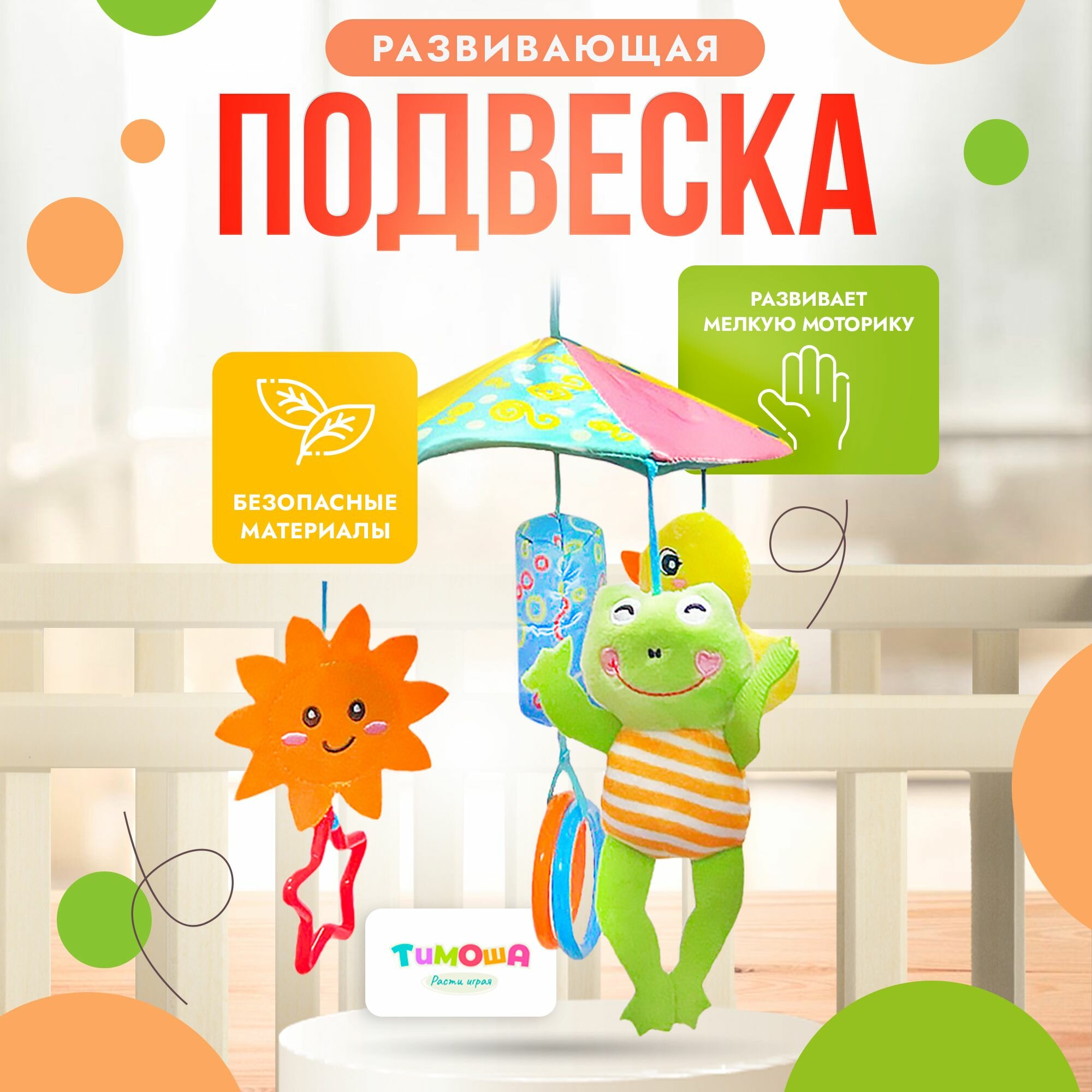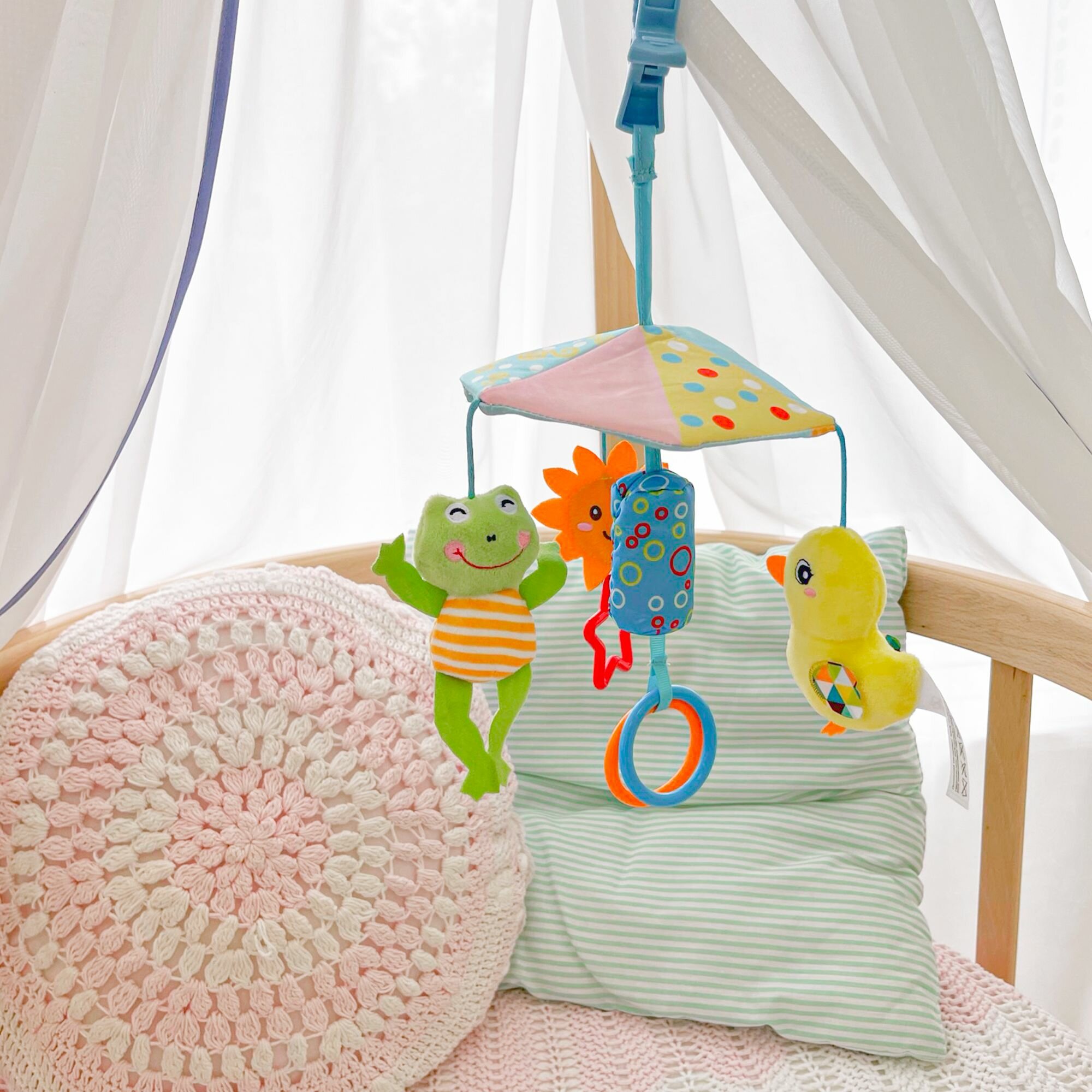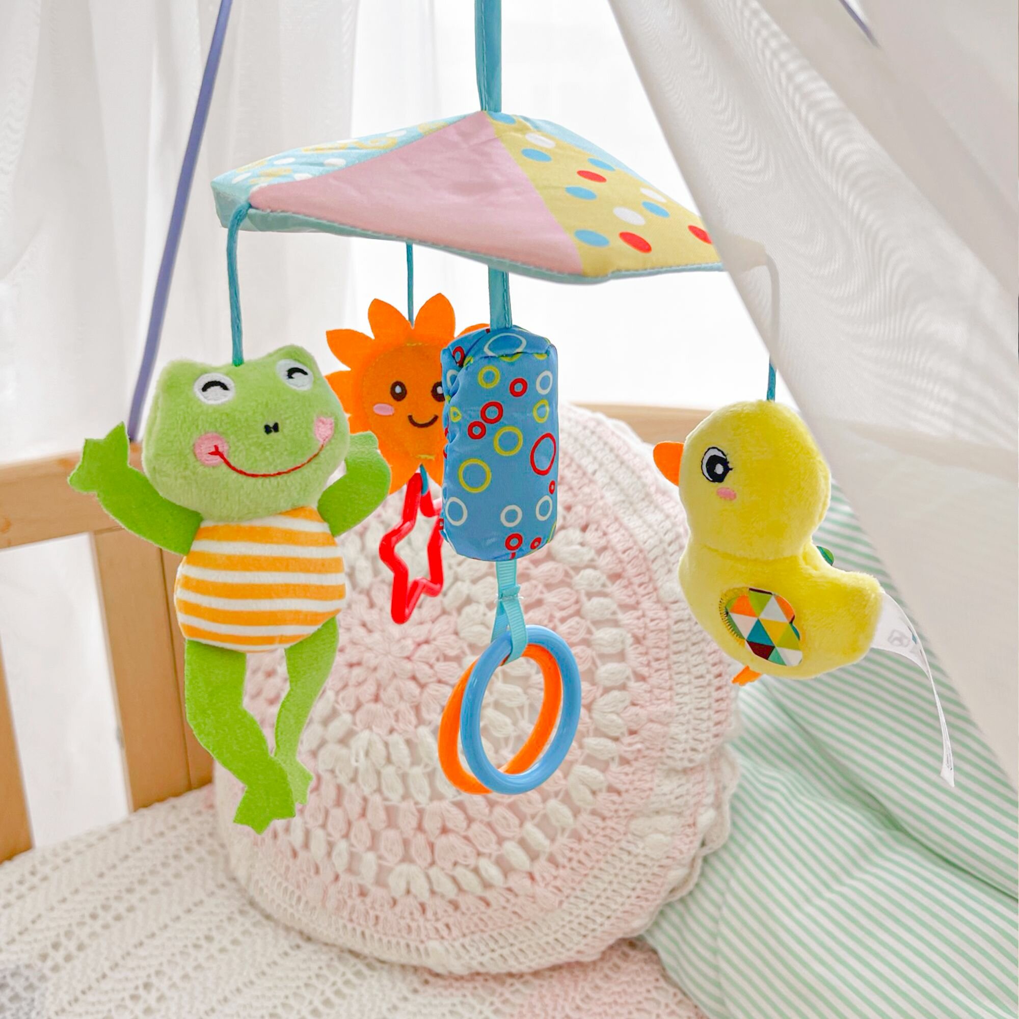 Подвеска в кроватку SHARKTOYS "Утка", с погремушками и зеркальцем, текстиль интересное: