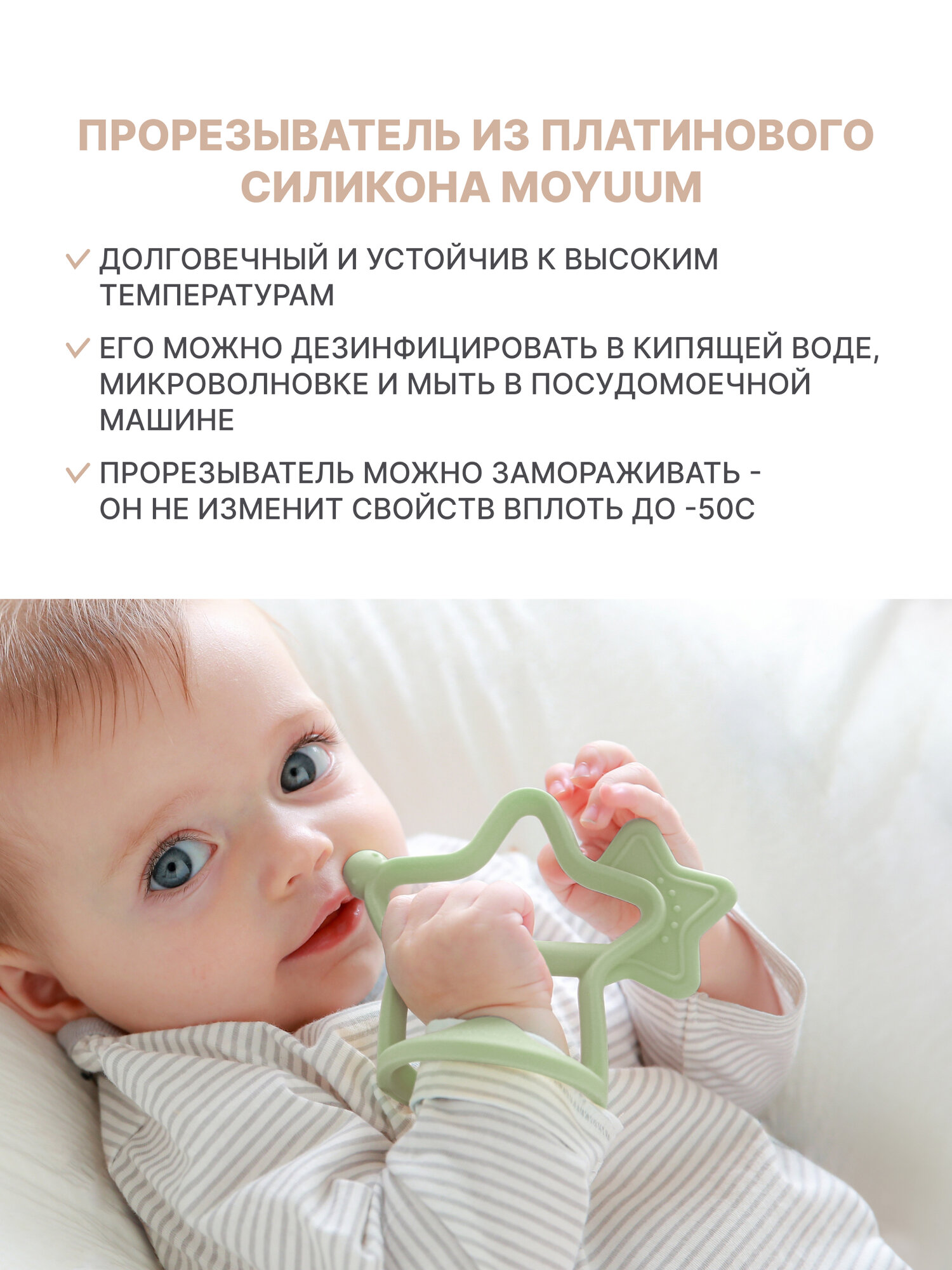 Прорезыватель для зубов грызунок MOYUUM "Звездочка" платиновый силикон для детей от 3 месяцев, светло-серый