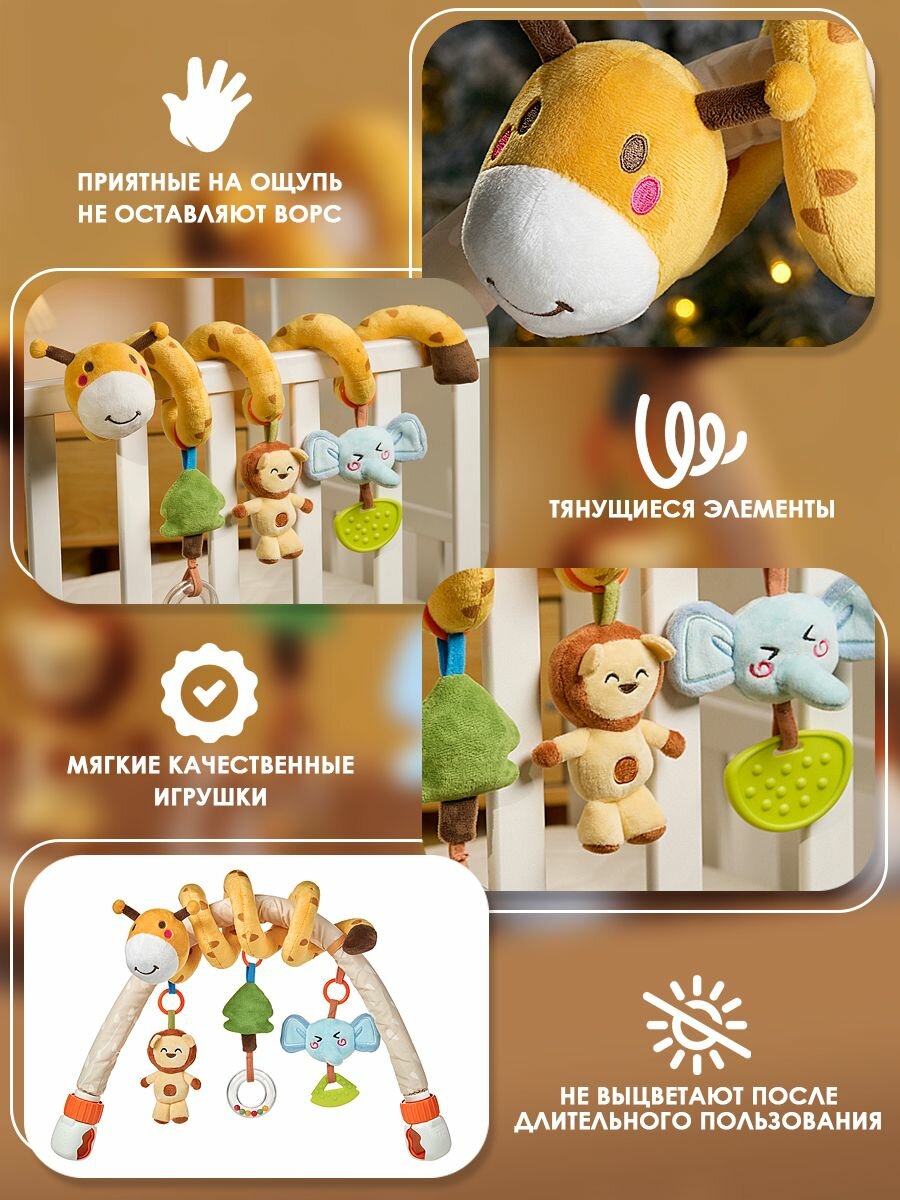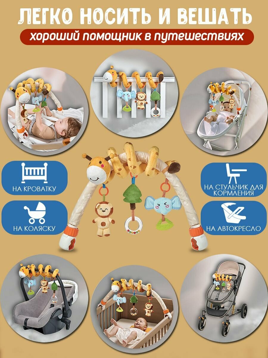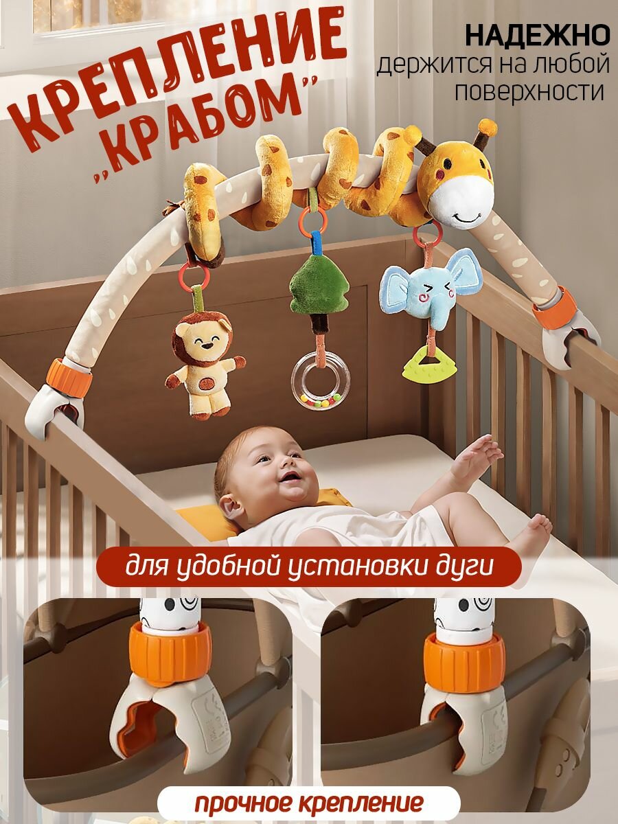 Развивающая дуга с игрушками. Игрушки для новорожденных от 0. Cпираль растяжка на кроватку и коляску. Погремушка для новорожденного интересное: