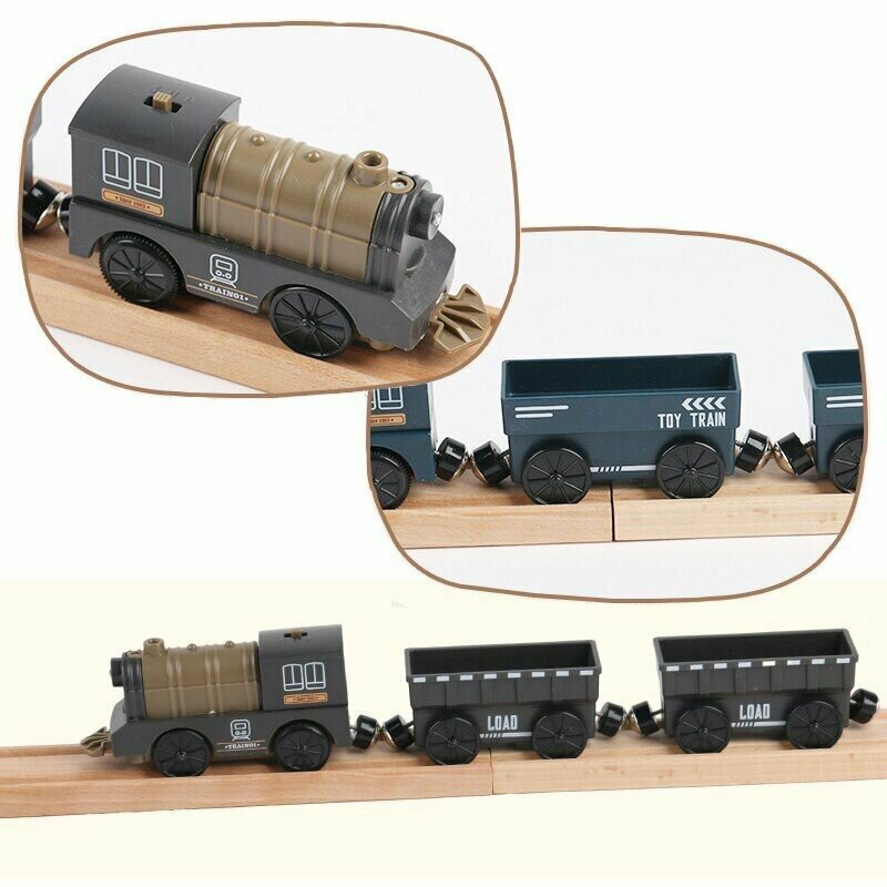 Электропоезд на батарейках для деревянной железной дороги, паровоз электрический с грузовым вагоном и грузом на магнитах