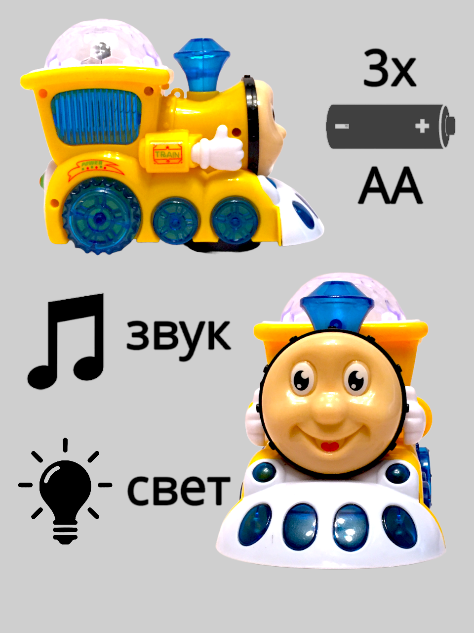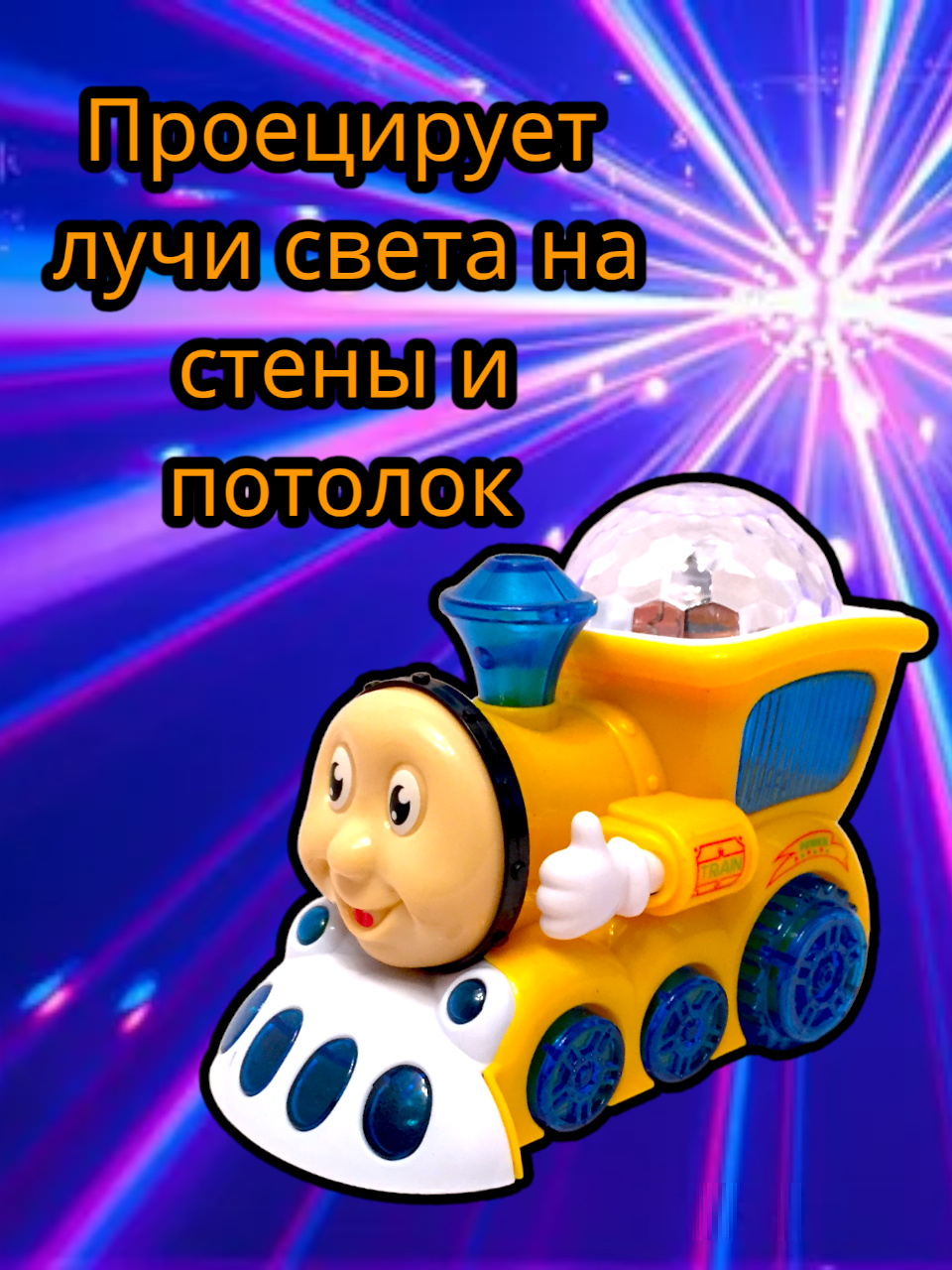 Музыкальный паровоз на батарейках "Желтый" (свет, звук, ездит, проекция) интересное: