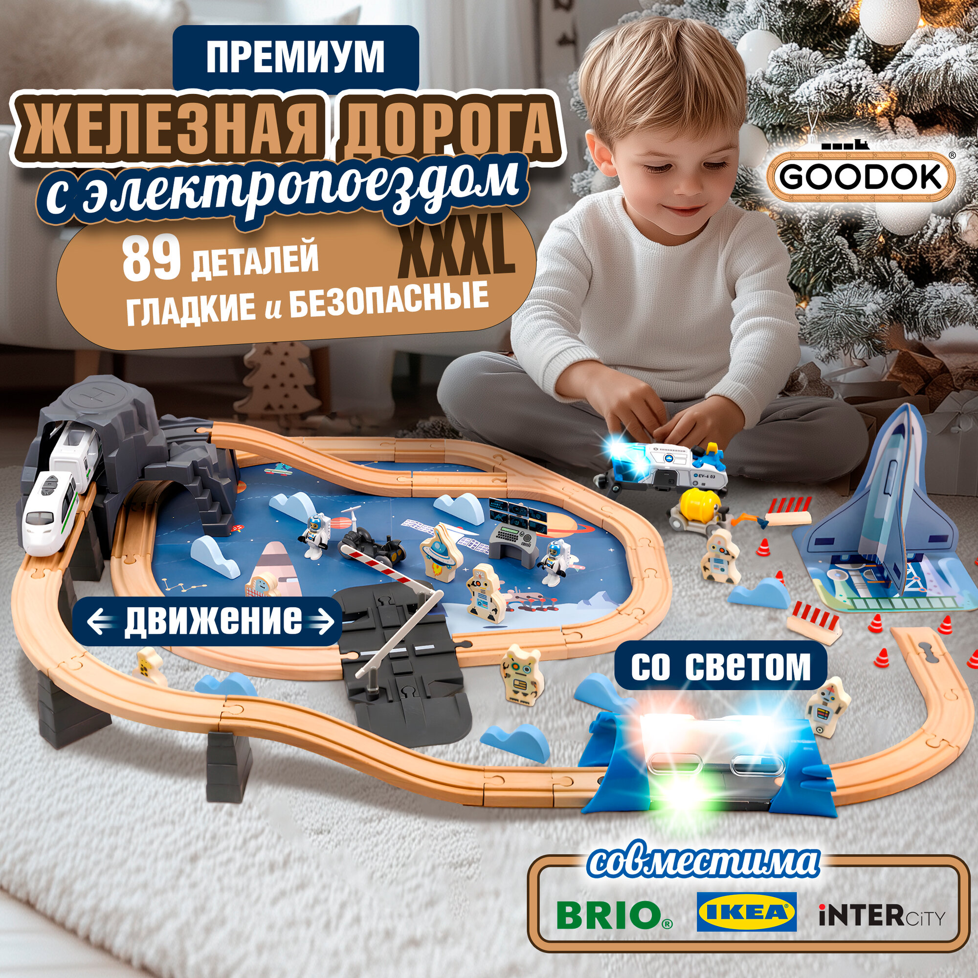 Деревянная железная дорога 1TOY GOODOK "Космопорт" с электропоездом и аксессуарами, 89 деталей интересное:
