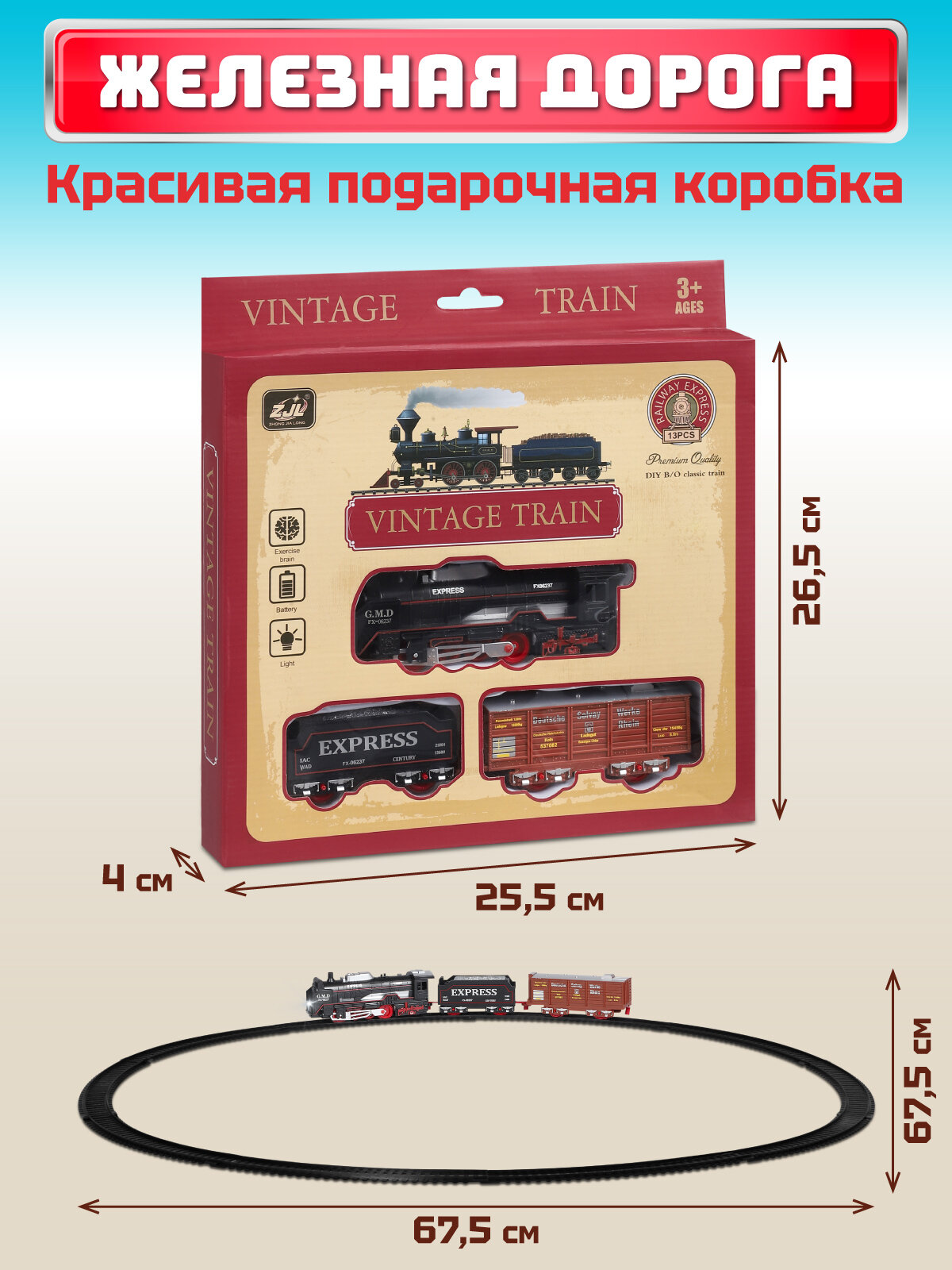 СохранитьЖелезная дорога классическая, локомотив/вагоны, игровой набор, играем в профессии, машинист поезда, свет, JB0405171 интересное: