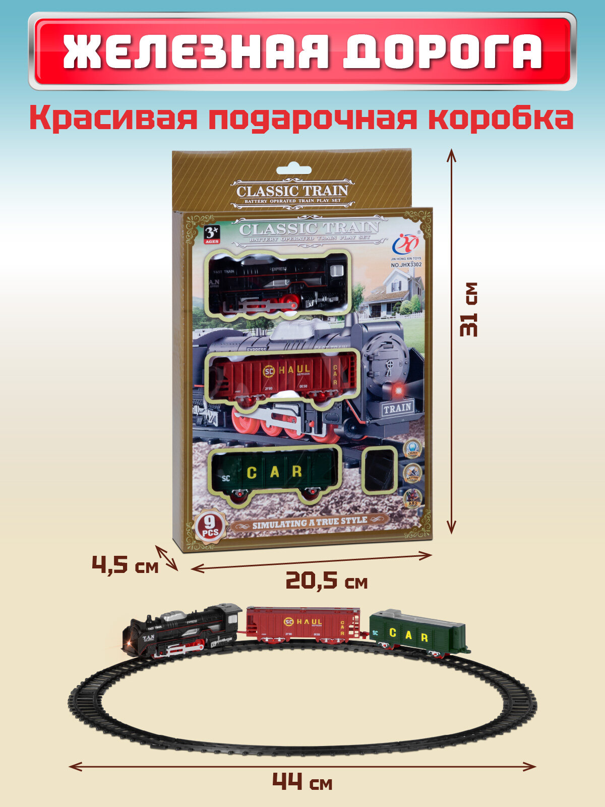 Железная дорога классическая, локомотив/вагоны, игровой набор, играем в профессии, машинист поезда, свет, JB0405179