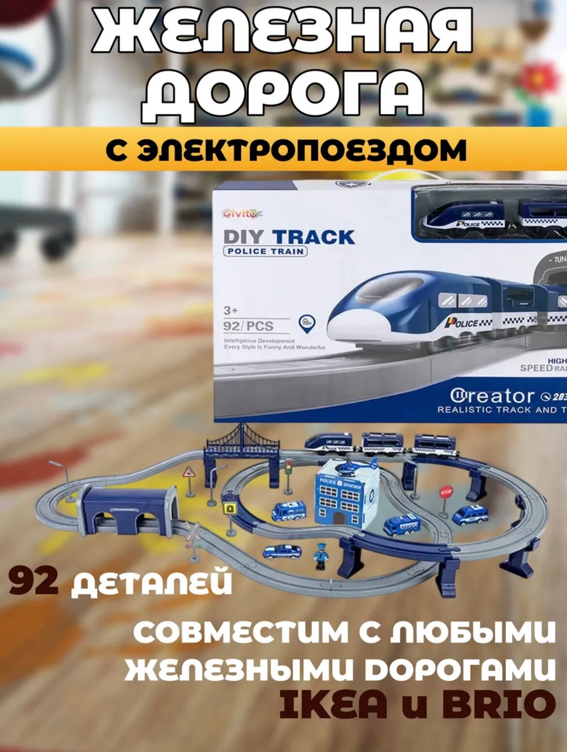 Двухуровневая железная дорога с электропоездом и машинами, 92 детали интересное: