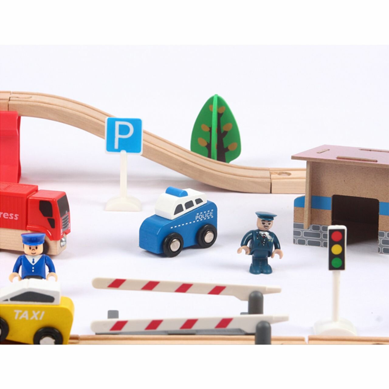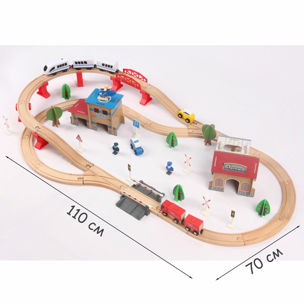 Детская деревянная железная дорога с поездом на батарейках, станцией с вертолетной площадкой