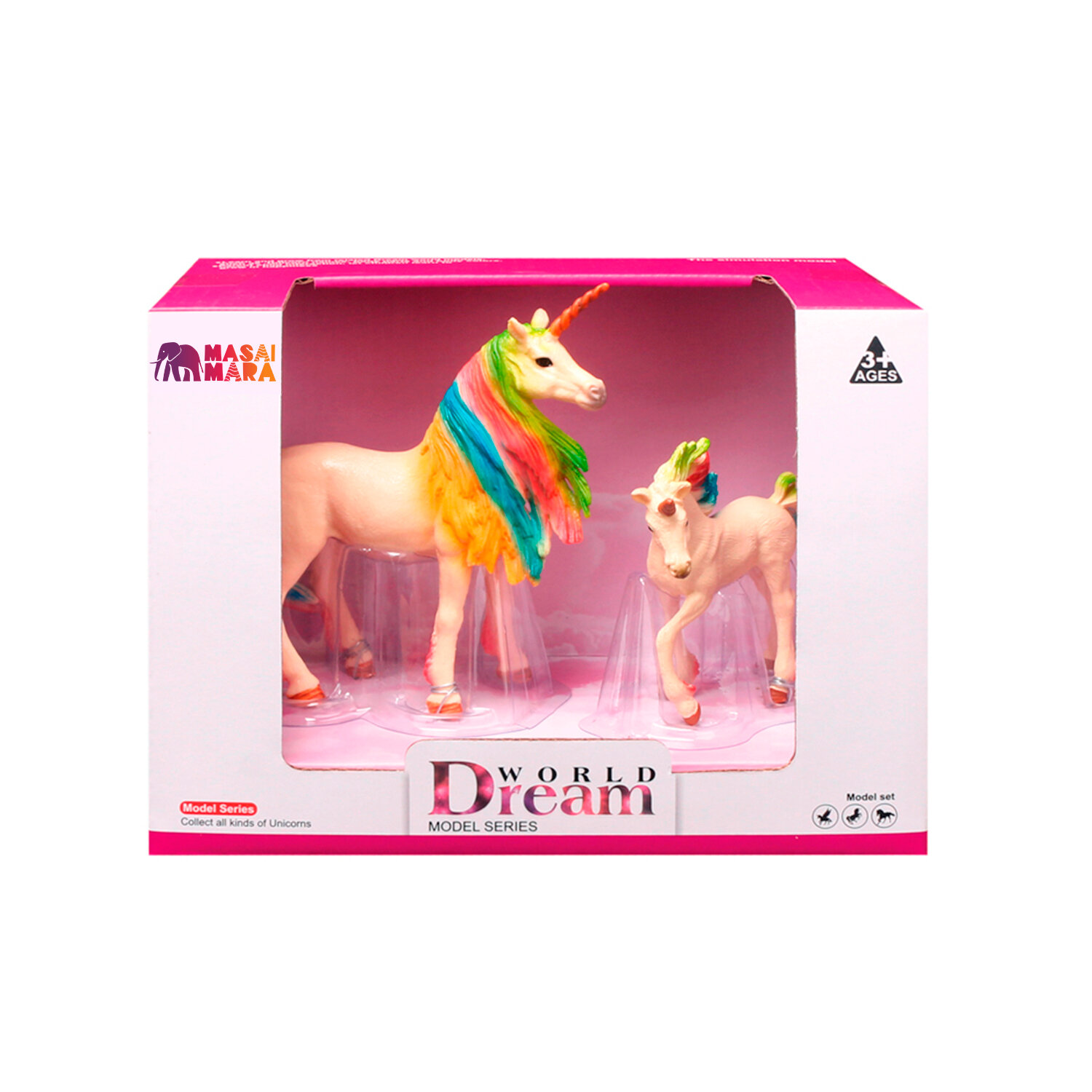 Набор фигурок серии "Мир фэнтези". Семья персиковых единорогов с розово-желтой гривой, (единорог и жеребенок-единорог)