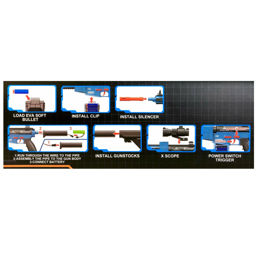 | Комплектация | автомат; резиновые пули 10шт.; мягкими пули 5шт; нож; фигурка солдатика; очки; рация. |