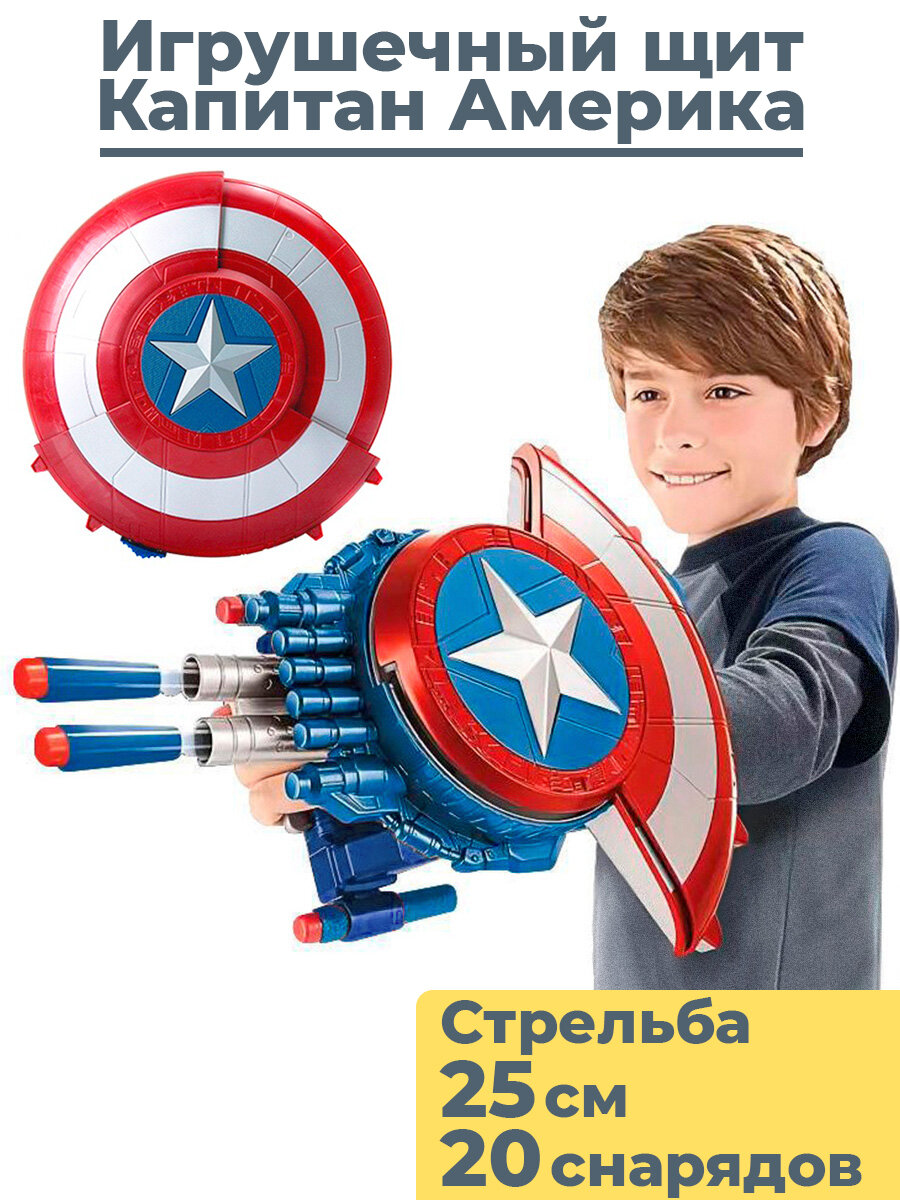 Игрушечный щит со стрельбой Капитан Америка Мстители Captain America Avengers 25 см 20 пуль мишень интересное:
