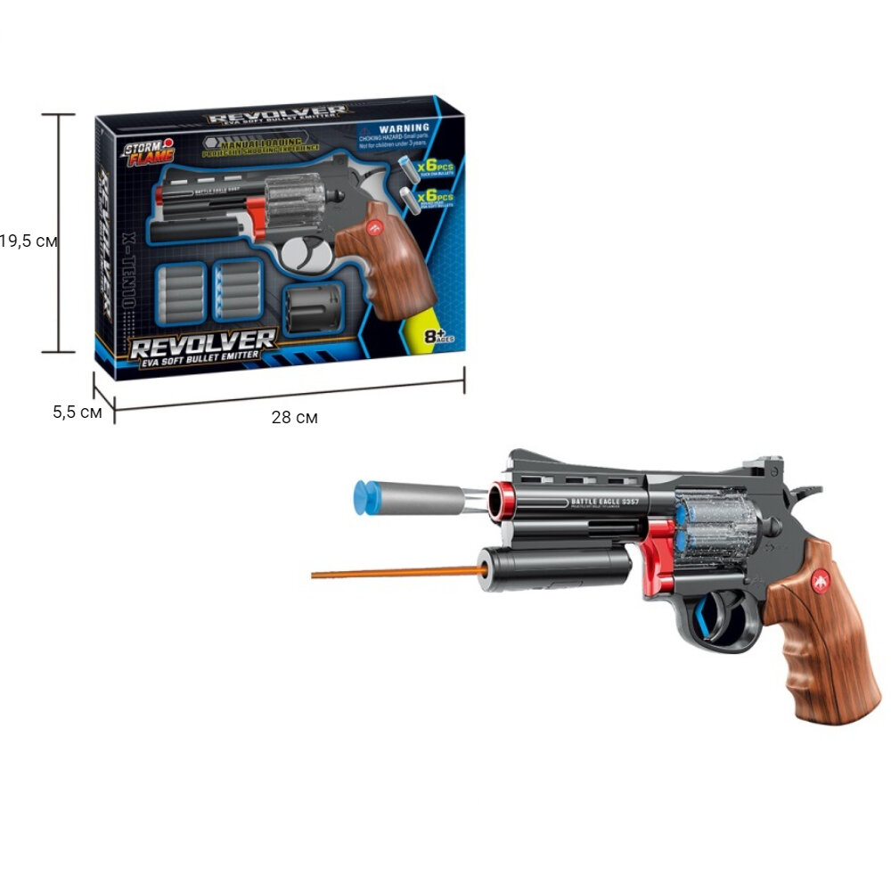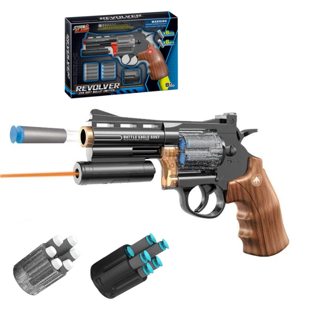Игрушечное оружие пистолет револьвер 23 см для мальчиков, 12 мягких пуль, лазерный прицел, сменный барабан интересное: