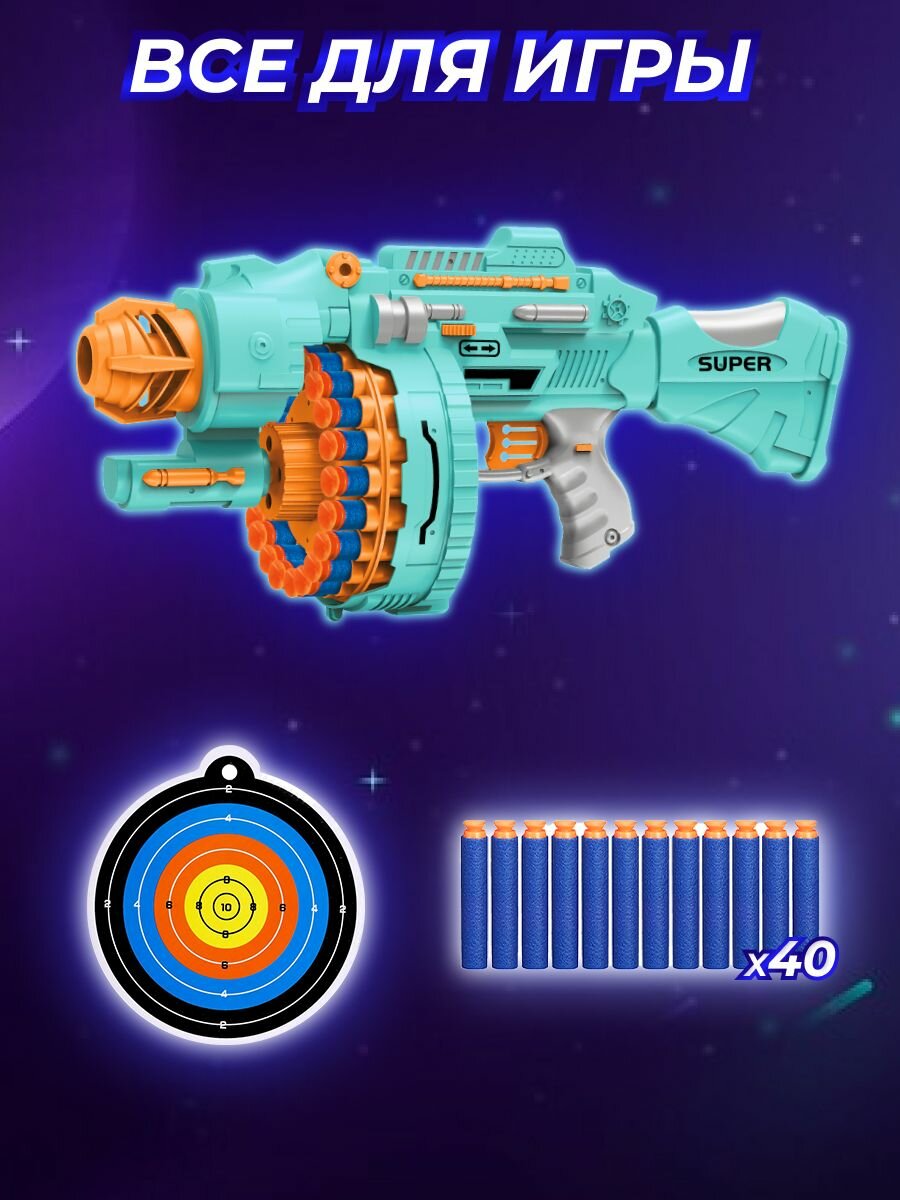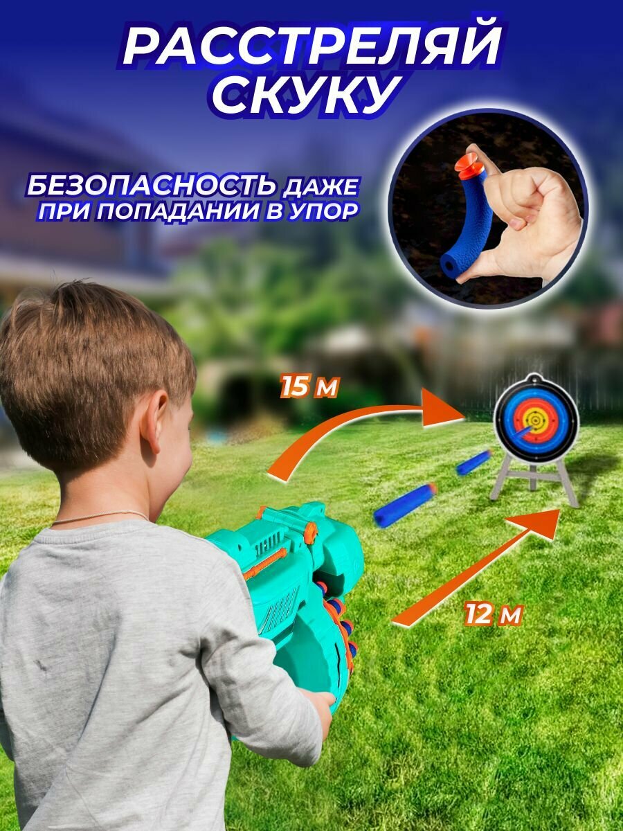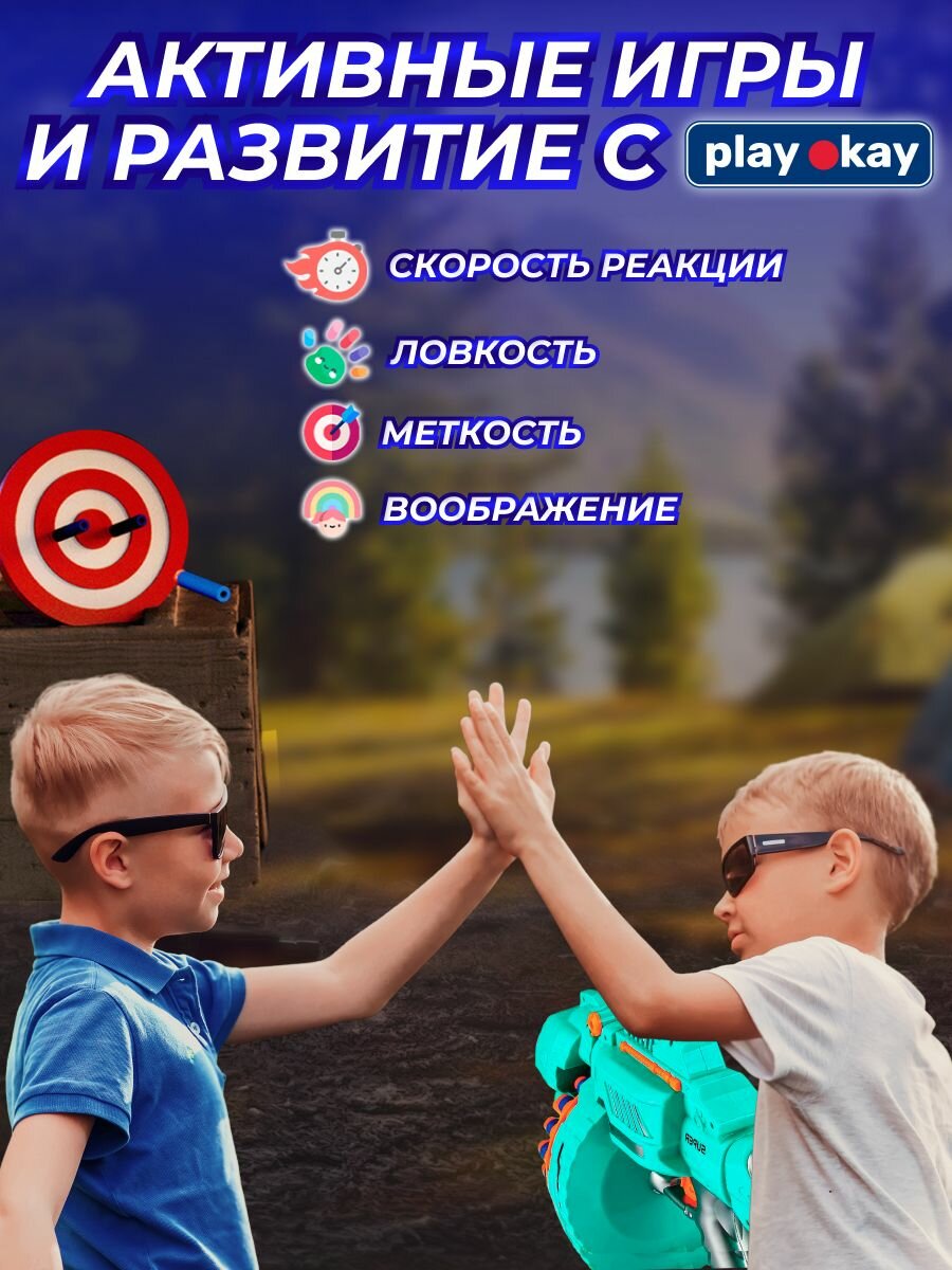 Купить Бластер с мягкими пулями Play Okay на присосках, бумажная мишень, 4 батарейки (не входят в комплект), abs-пластик, бирюзовый