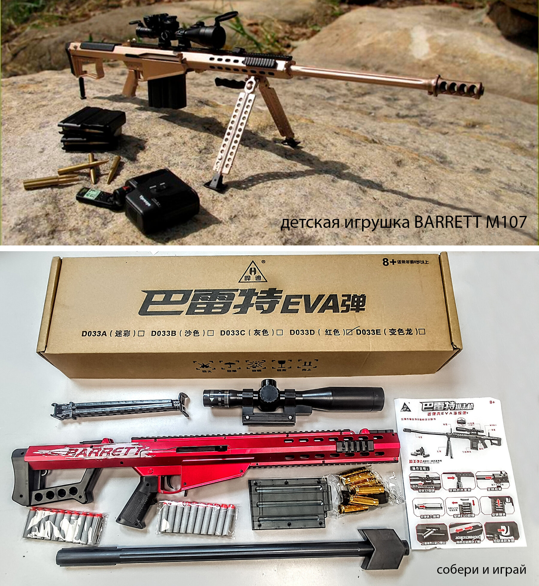 Ниже Вы можете прочитать отзывы на Пневматическая детская снайперская винтовка Barrett М82 барретт М107 игрушка c выбросом гильзы, ознакомится с подробными характеристиками, посмотреть интересные обзоры и фотографии на Пневматическая детская снайперская винтовка Barrett М82 барретт М107 игрушка c выбросом гильзы.
