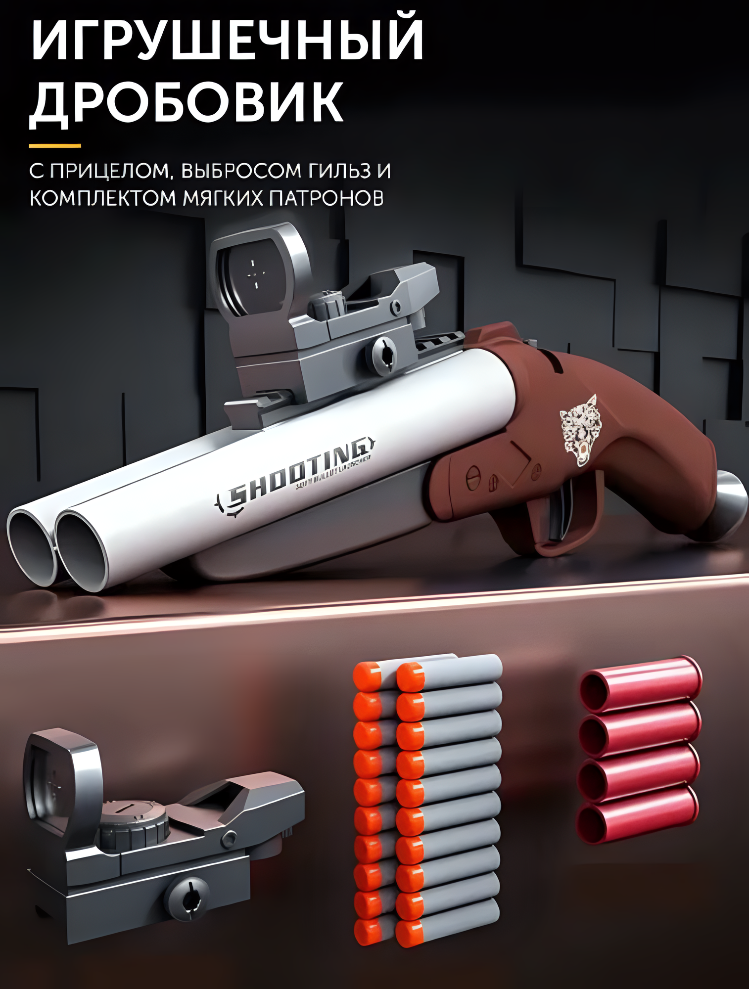 Игрушечный пистолет бластер ( дробовик ) с прицелом, выбросом гильз и комплектом мягких патронов / коричневый интересное: