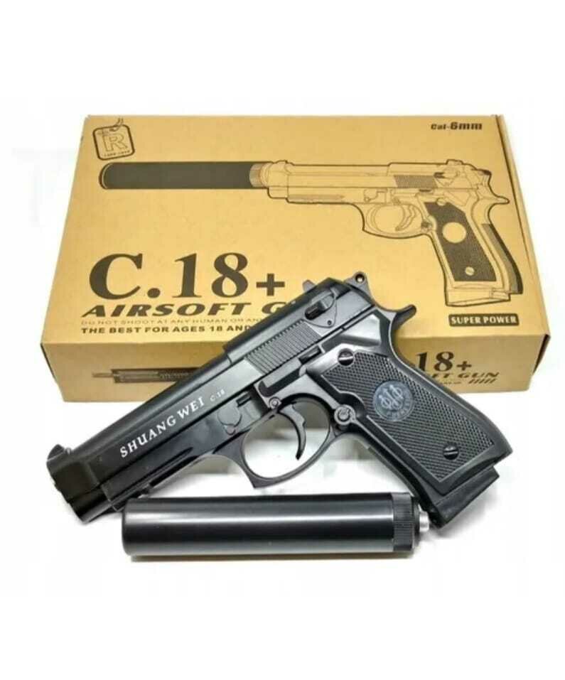 Купить Детский пистолет на пульках Beretta игрушечный металл и пластик C.18+ с глушителем