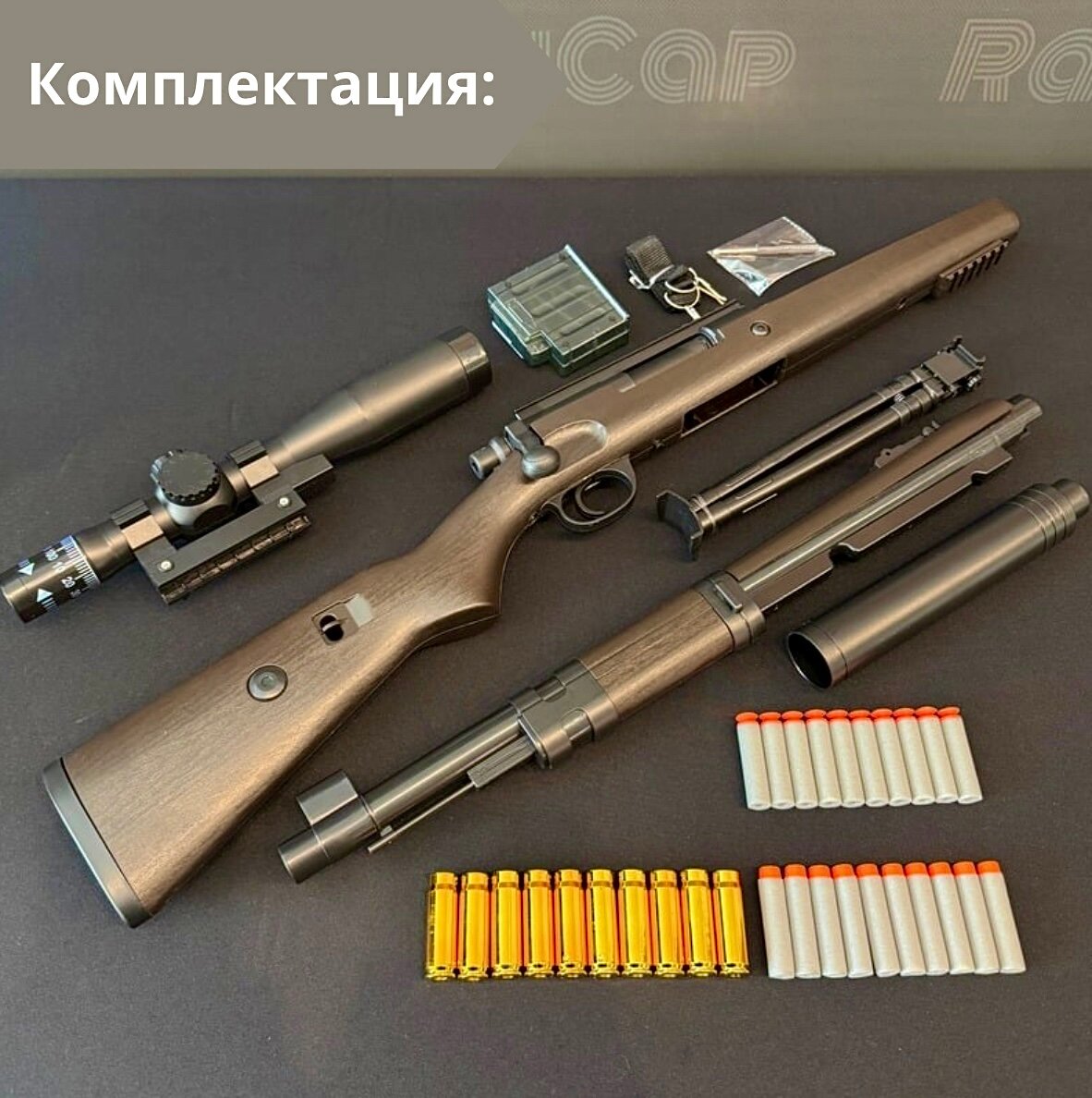 | Комплектация | Ресивер 1 шт. Ствол 1 шт. Оптика 1 шт. Сошки 1 шт. Приклад 1 шт. Магазин 1 шт. пули с присосками 10 шт. Гильзы 5 шт. Инструкция 1 шт. |