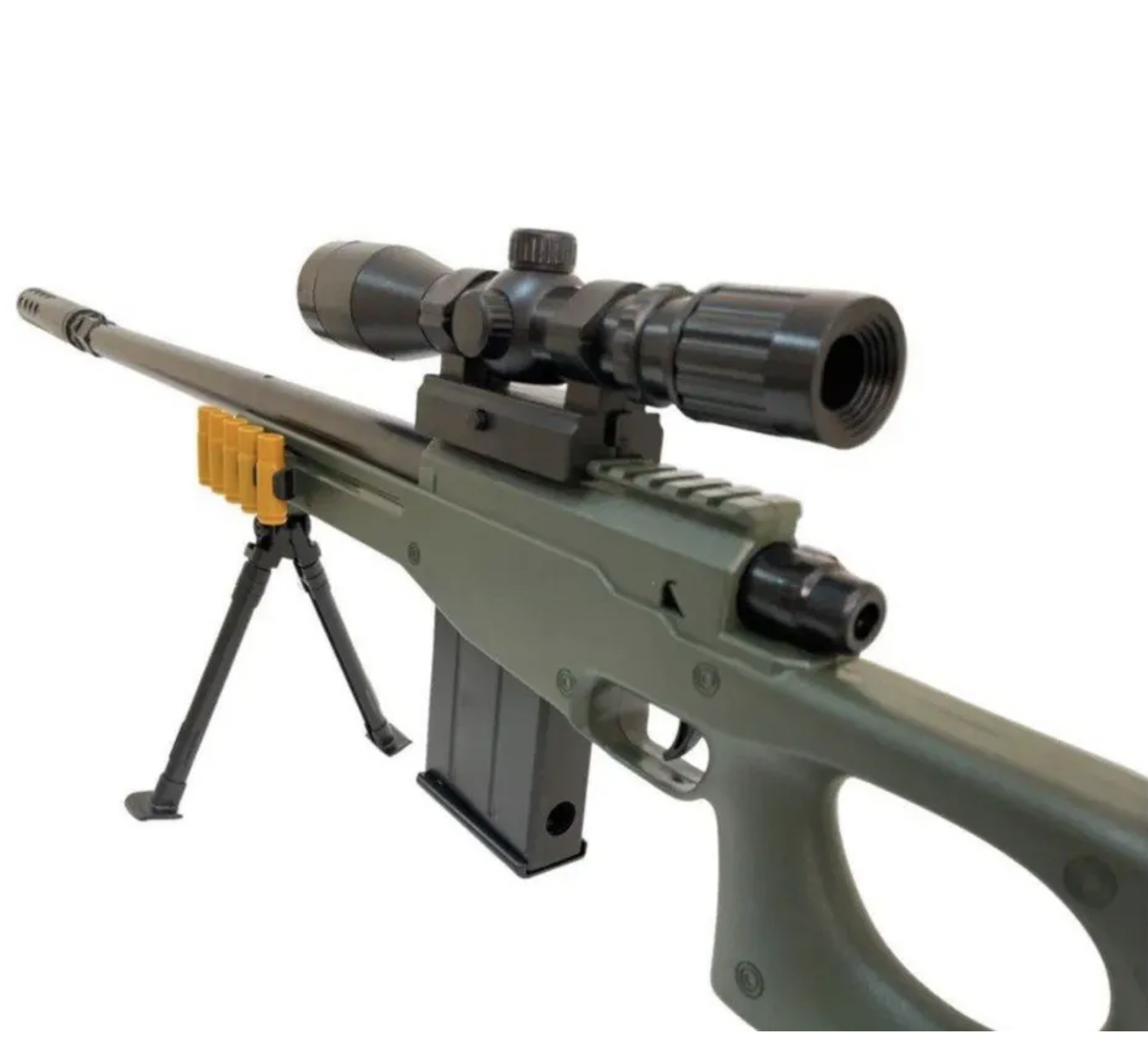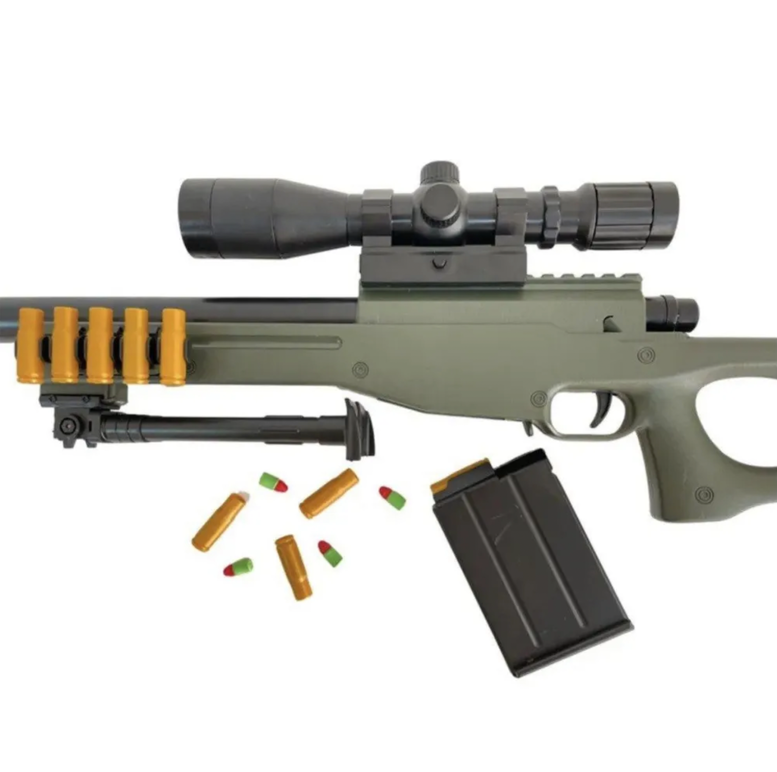 | Комплектация | винтовка 1 шт, деталь ствола 1 шт, прицел 1 шт, обойма 1 шт, мягкие пули 10 шт, патроны-гильзы 10 шт, защитные очки 1 шт, ремешок 1 шт, сошки 1 шт |