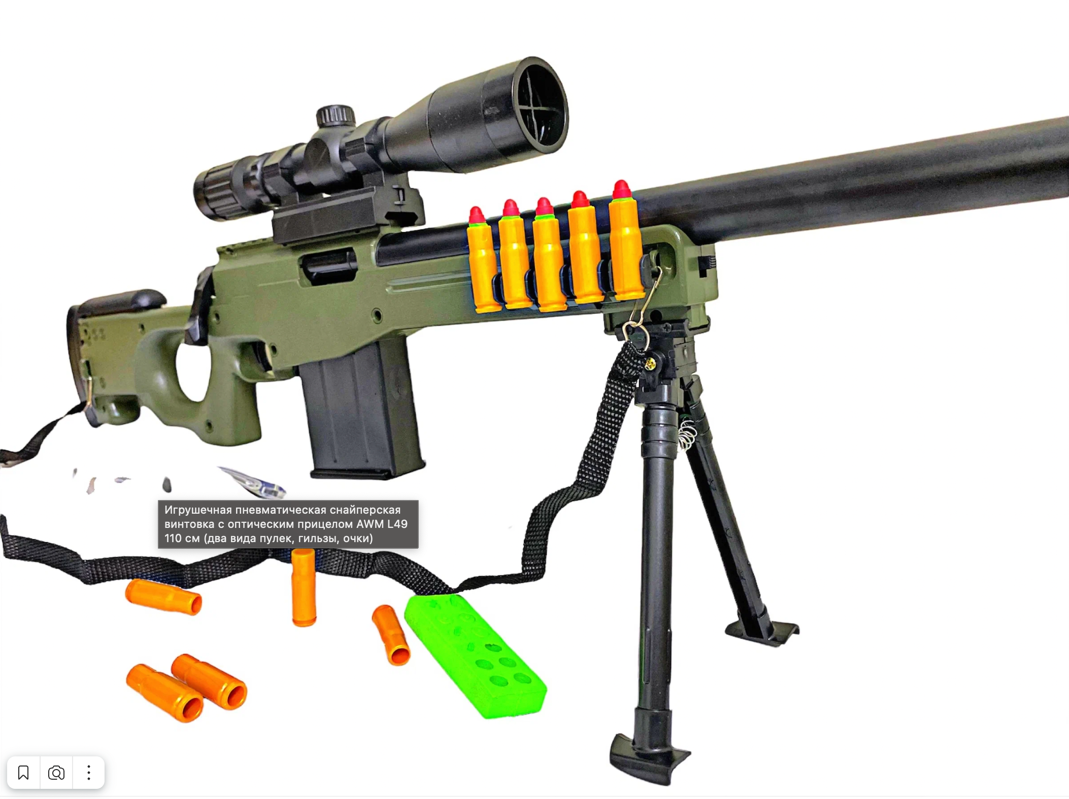 Ниже Вы можете прочитать отзывы на Игрушечная снайперская винтовка c оптическим прицелом AWM L49 110 см (два вида пулек, гильзы, очки), ознакомится с подробными характеристиками, посмотреть интересные обзоры и фотографии на Игрушечная снайперская винтовка c оптическим прицелом AWM L49 110 см (два вида пулек, гильзы, очки).