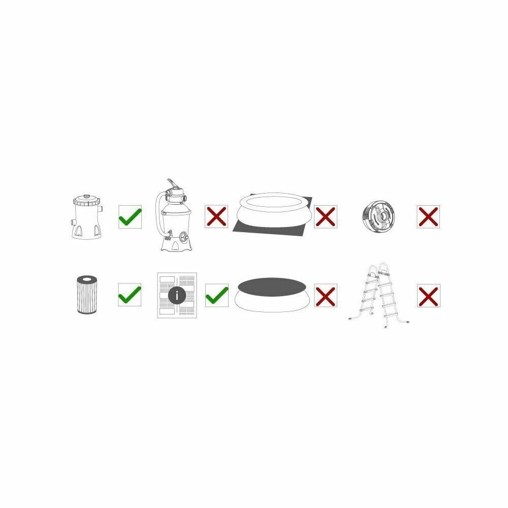 | Дополнительная информация | устойчивость к влиянию атмосферной среды: дождь, ветер, смена температур и ультрафиолетового излучения; в комплект поставки входит фильтр-насос производительностью 1249 л/ч для очистки и циркуляции воды, а также картридж тип I (Bestway 58093), шланги и хомуты, необходимые для подключения к бассейну |