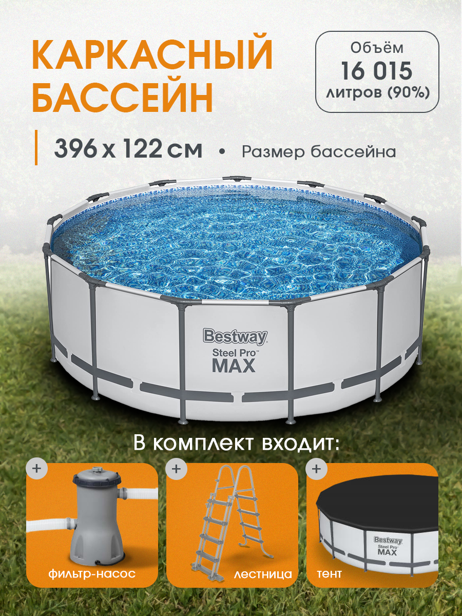 Бассейн каркасный Steel Pro Max Bestway 427x107 см, 13030 л, в комплекте фильтр-насос, лестница, тент