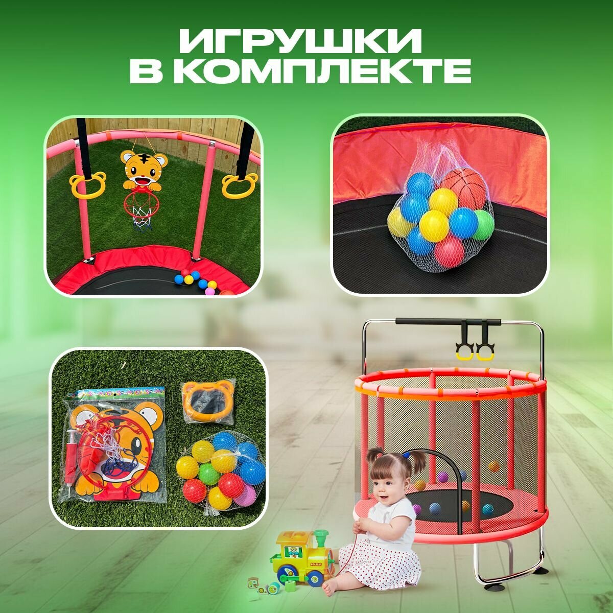 Батут каркасный с защитной сеткой, детский, с перекладиной и игрушками, для улицы и дома, 140 см, UOП-16K интересное: