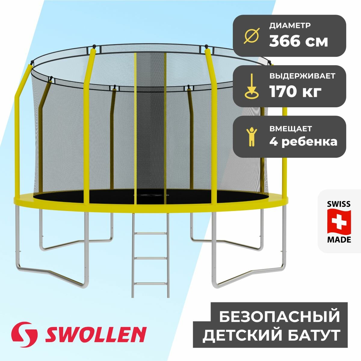 Батут с защитной сеткой SWOLLEN Comfort Overlap 12 FT (366 см) (Yellow) детский, для детей, уличный, для улицы, для дачи интересное: