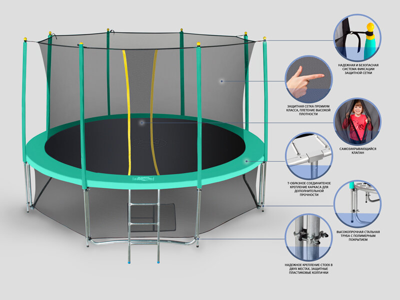| Состав набора | каркас батута, комплект пружин, защитный мат, верхняя защитная сетка, нижняя защитная сетка, лестница, ключ для установки пружин, набор инструментов и крепежей |