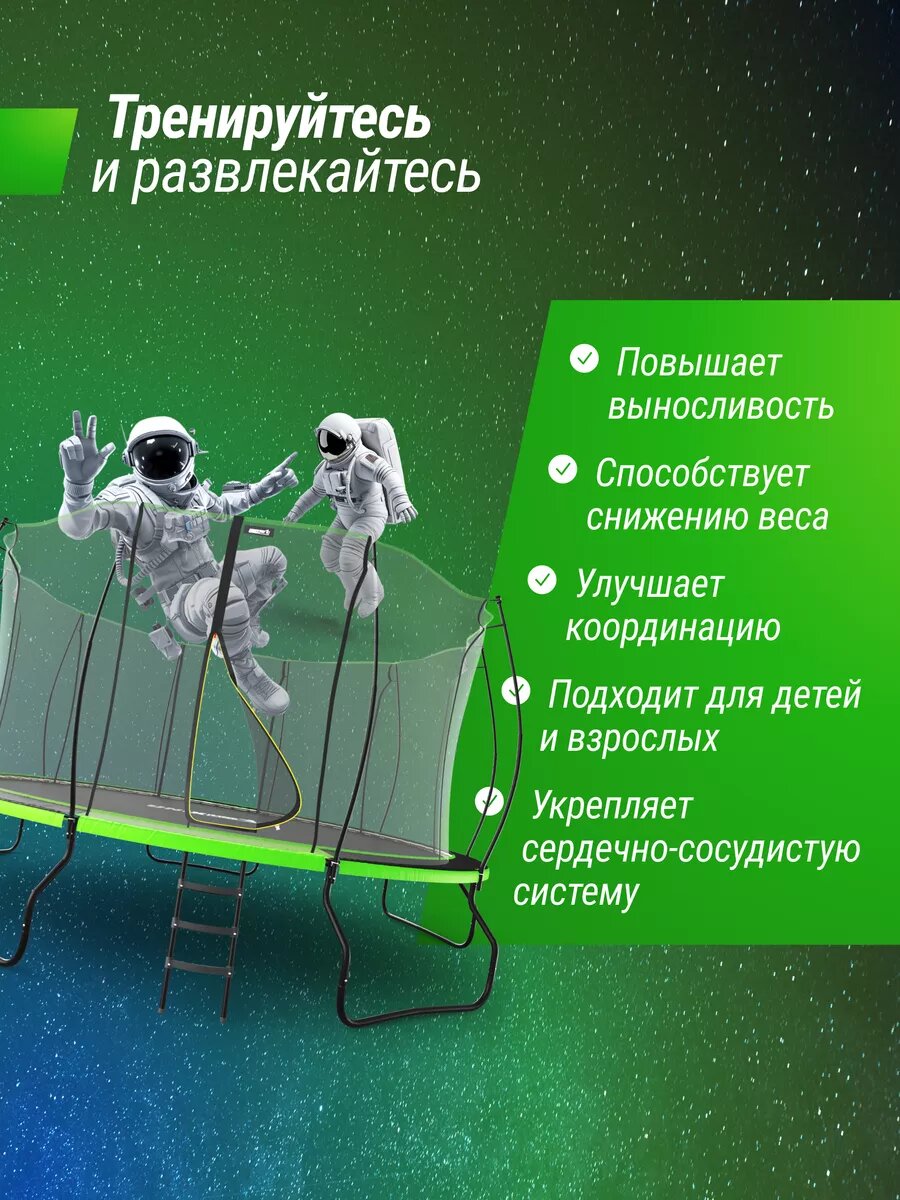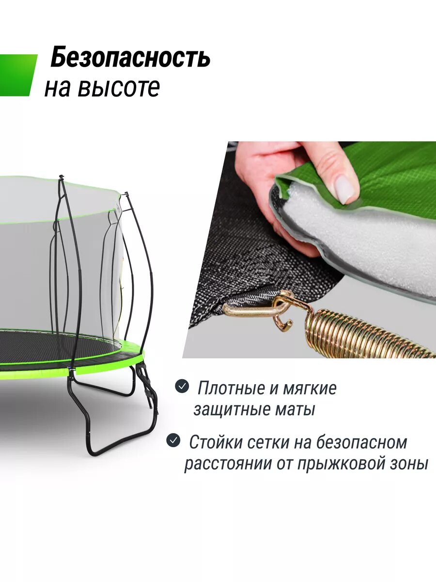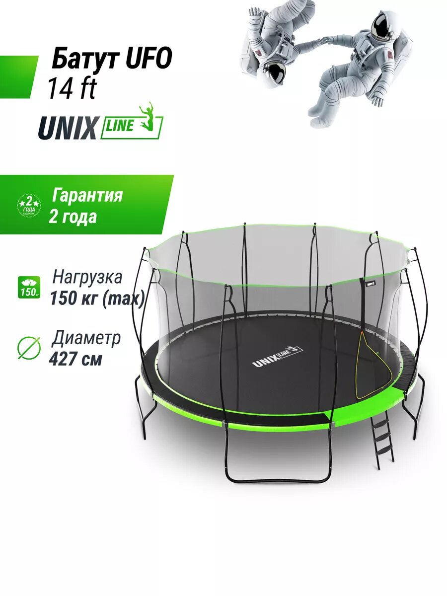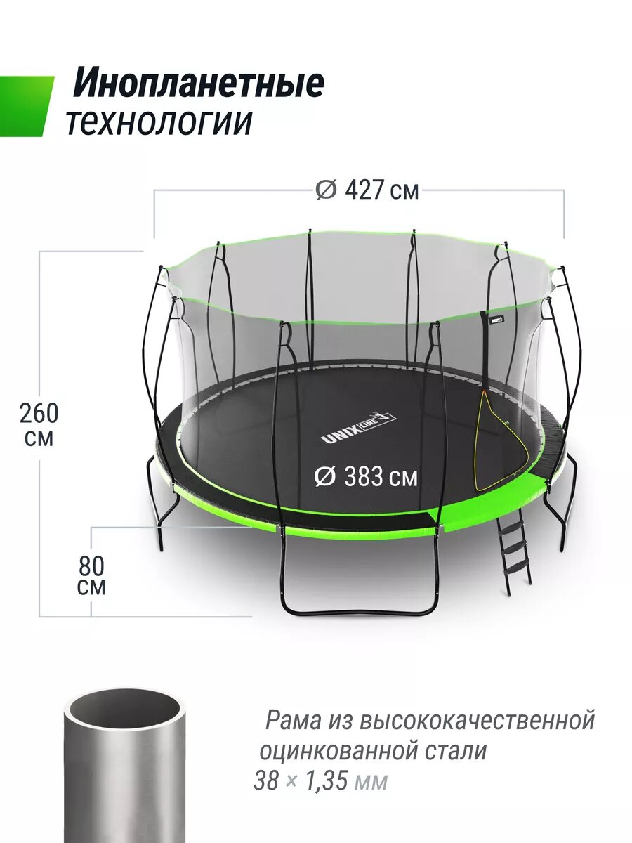 СохранитьБатут каркасный UNIX Line UFO 14 ft Green, диаметр 427 см, до 150 кг, с внутренней защитной сеткой, для дома и улицы интересное: